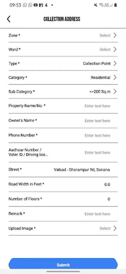Enter details like type of waste, the quantity of waste, type of property, owner's name, phone number, ward, zone, and more.