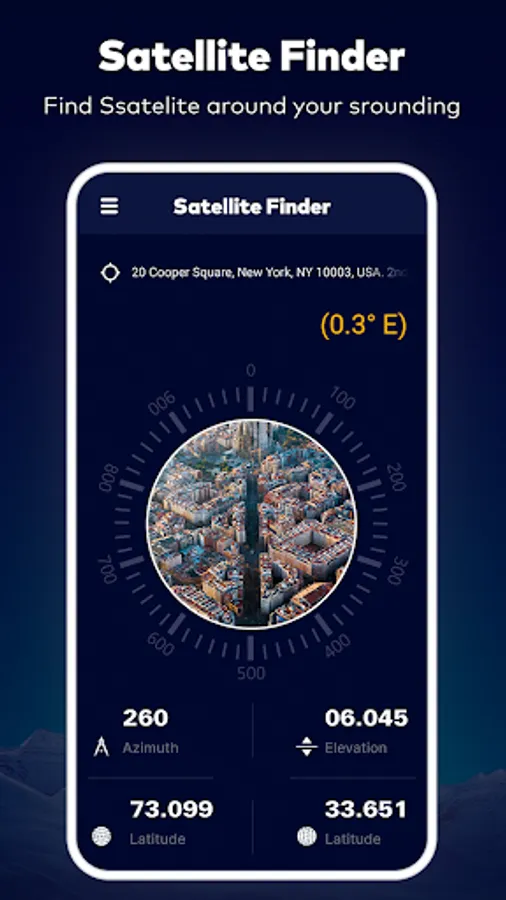Satellite Finder – Dish Pointer provides you the information about right azimuth elevation and right longitude & latitude. You can get all live satellites in Satellite finder with Dish Pointer antenna. There is pretty difficult to find a TV Dish with Gyro Compass to locate right dish antenna position, So Sat director & Antenna Dish aligner let you know about all of live satellite right directions so you find all nearby satellite with sat finder & Dish Director.