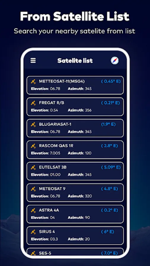 Sat Director Satellite Finder & Dish Pointer is a optimized tool to find all satellites near you. Sat finder also assist you to know about things related satellites. Satfinder & Dish Pointer is a New Satellite director app to get the accurate position of satellites. Sat Finder also identified as Dish pointer & Satellite finder. You can adjust any Satellite Dish with satfinder & dish pointer.