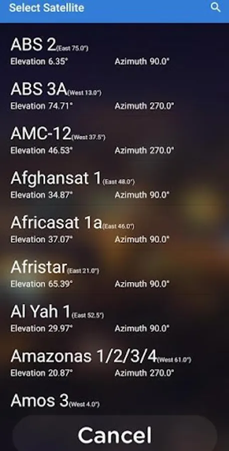 This satellite finder dish pointer app shows you direction in which you are going align your satellite dish. Based on your location the following satellites are available: