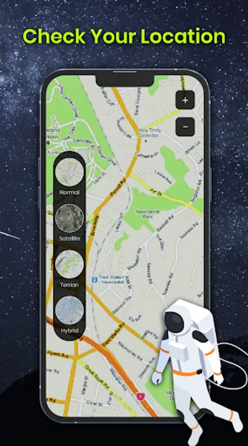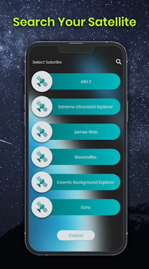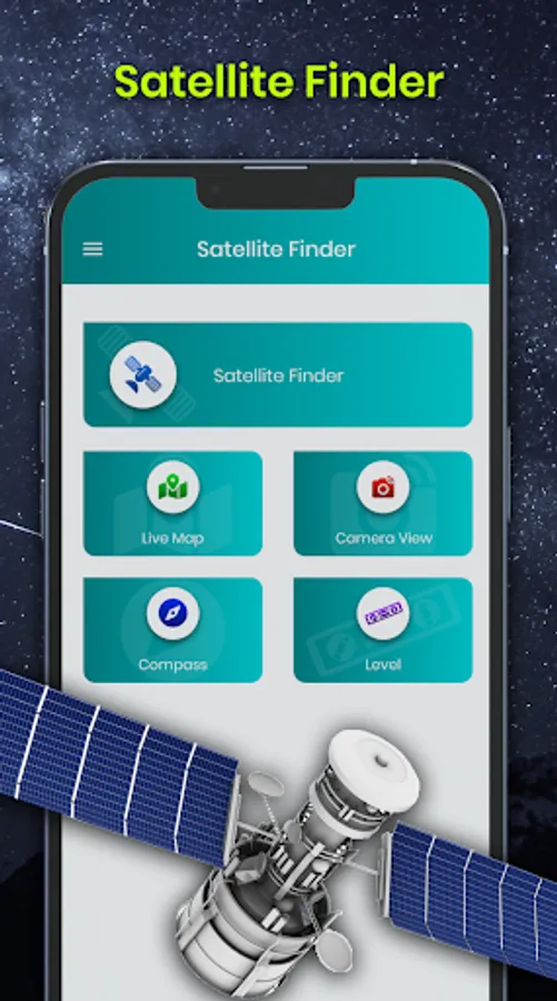 - Satellite view shows you the live location of all satellites within the SatFinder.