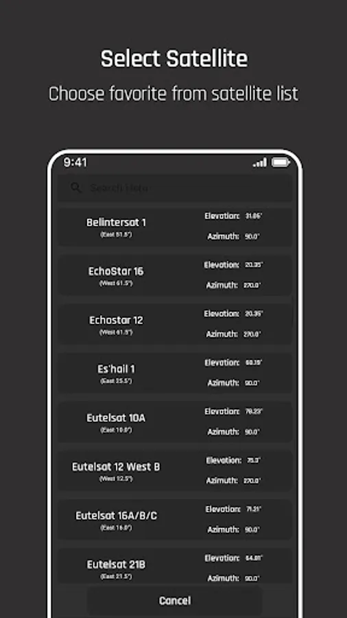Satellite finder for all tv dish app is a smart tool for aligning tv satellite dish network according to the coordinates and finding live satellites. TV satellites dish aligner app helps by pointing the satellite accurately in tv satellite search with satellite signal finder. It can be used anywhere in the world for setting tv dish according to any satellite including astra, intelsat, Amos, ChinaSat, Eutelsat etc from list. Satfinder quick dish alignment will provide a list of all satellites, LNB azimuth, elevation and tilt for your location based on your selected satellite. Satfinder quick dish pointer is easy and quick: you just need to enter your location or enable GPS to find your current position, select the satellite you are pointing it will give you most accurate value of azimuth, elevation and polarization angles according to that location with directed satelitte.