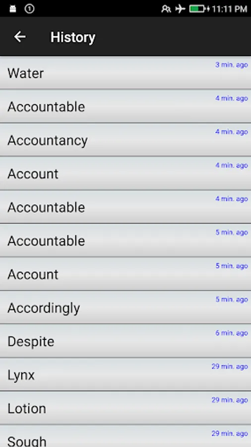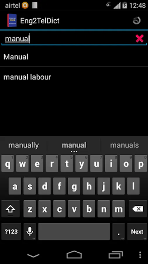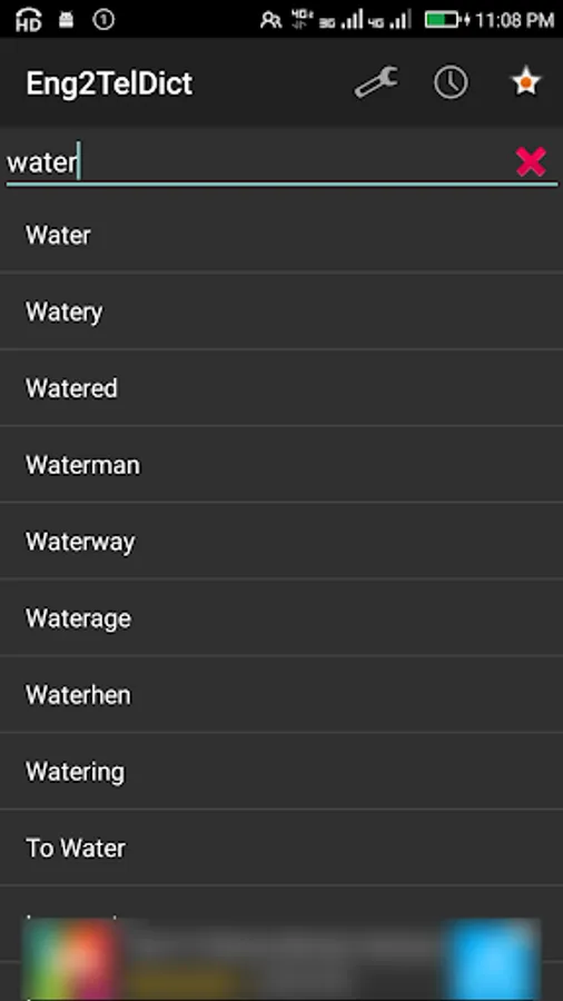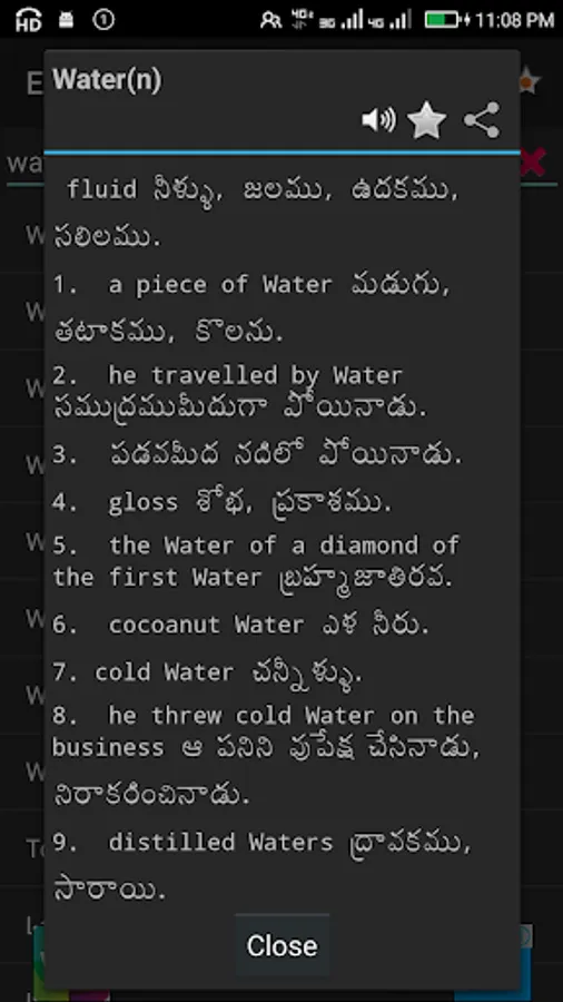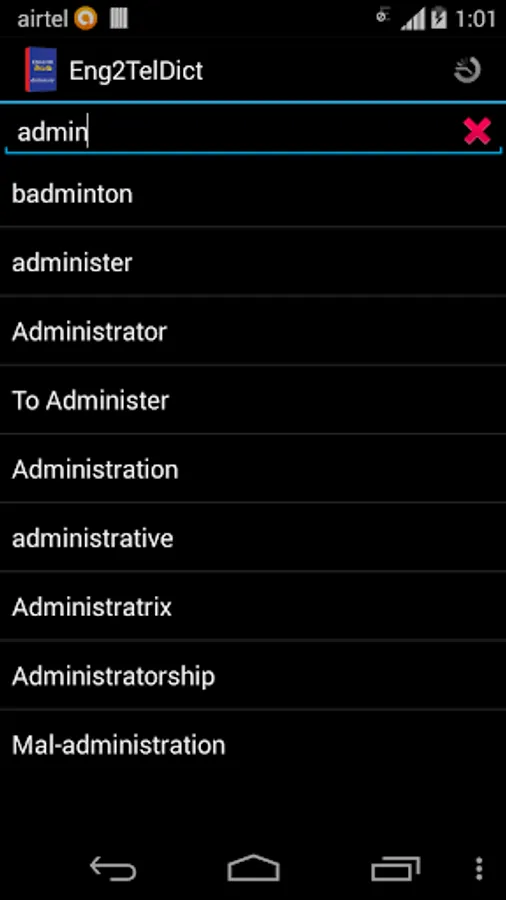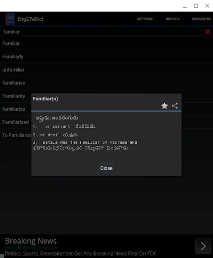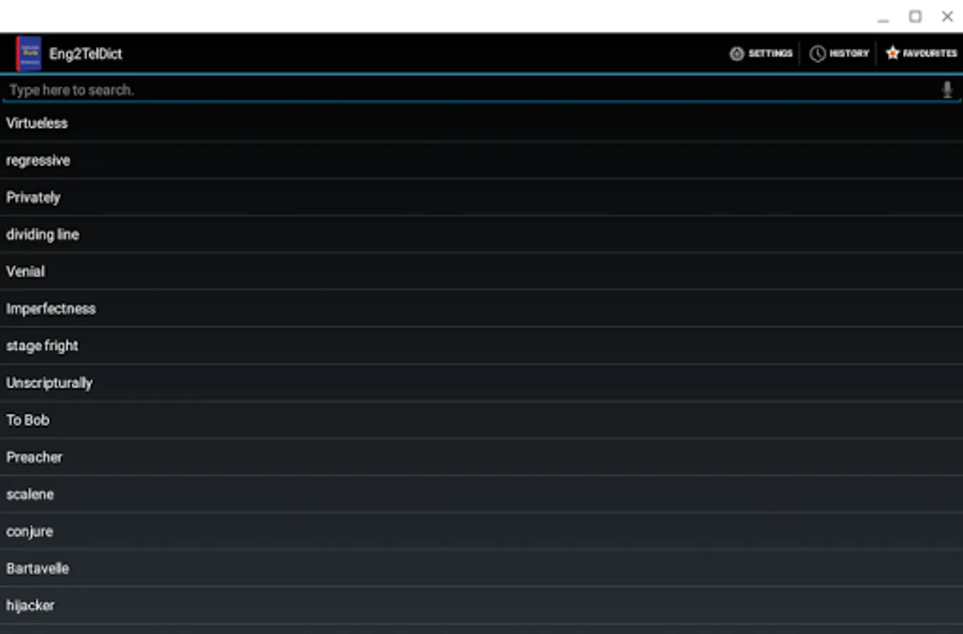 The dictionary shows the Telugu meaning in clear Telugu font. Use the search function to navigate to a term, or simply tap on the English word field to get the Telugu description.