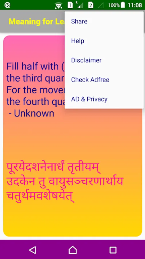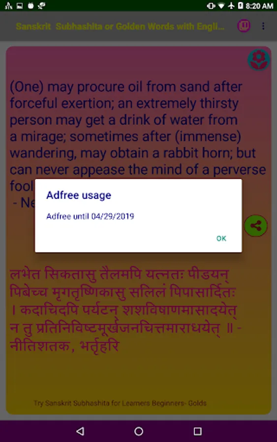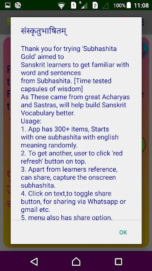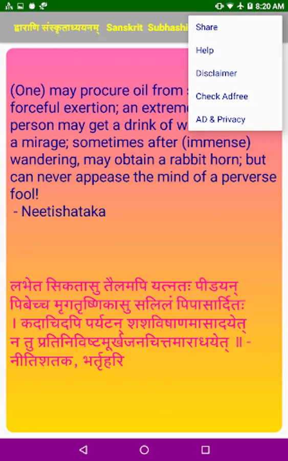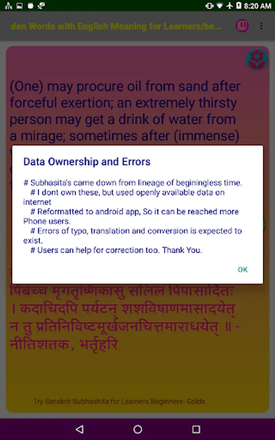 This Sanskrit Golden Sayings app contains many subhashitas in Devanagari script and meaning in English. These sayings are part of scriptures and great scholars of tradition.