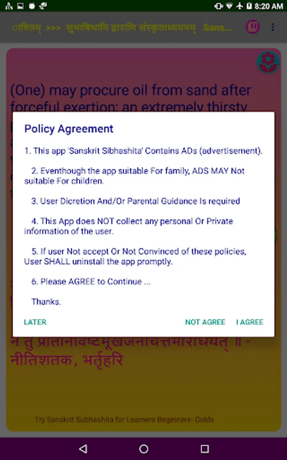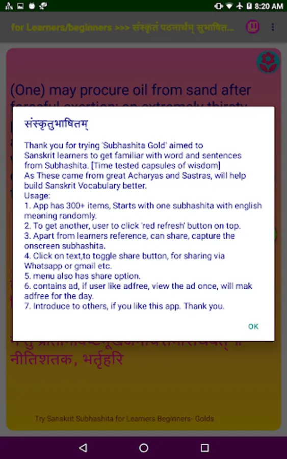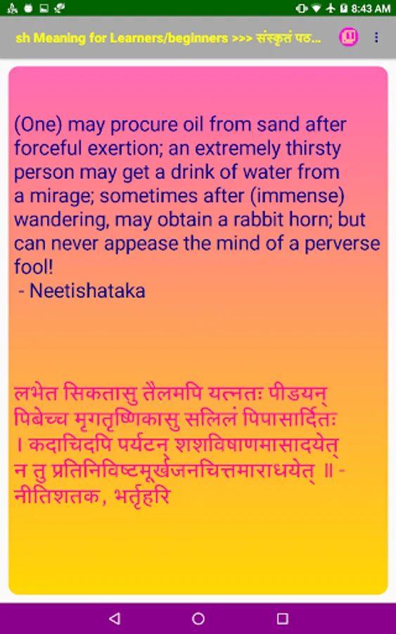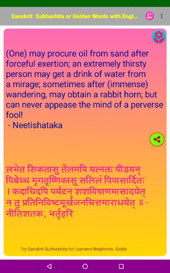 This content is targetted to those learning and starting to learn Sanskrit. This will help the beginner to familiarize the 'usage of Sanskrit words and sentences'. This is true as these slokas/saying/Subashita came down from the great source of knowledge, such as scriptures and great acharyas.