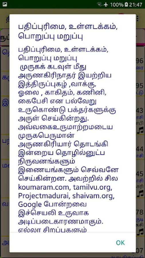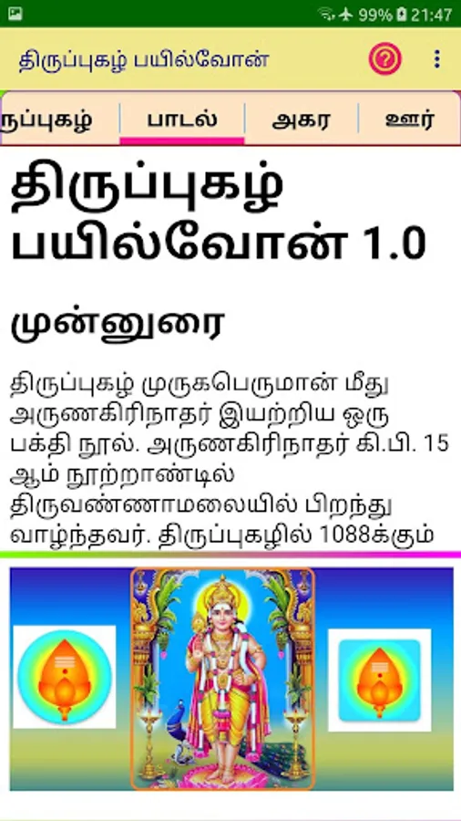 Arunagirinathar's devotion to Lord Muruga has been a blessing to the devotees in various forms such as vote, tile, paper, computer, handset. Murakuberuman Arunagriyar transformed this way and today's technology products and websites are doing the same. Some of them, such as koumaram.com, tamilvu.org, projectmadurai, shaivam.org, and Google, are the primary cause of this process. All specialties and responsibilities depend on them. It is solely responsible for its shape, layout and execution style. If so, please report the bug in the process. Thanks