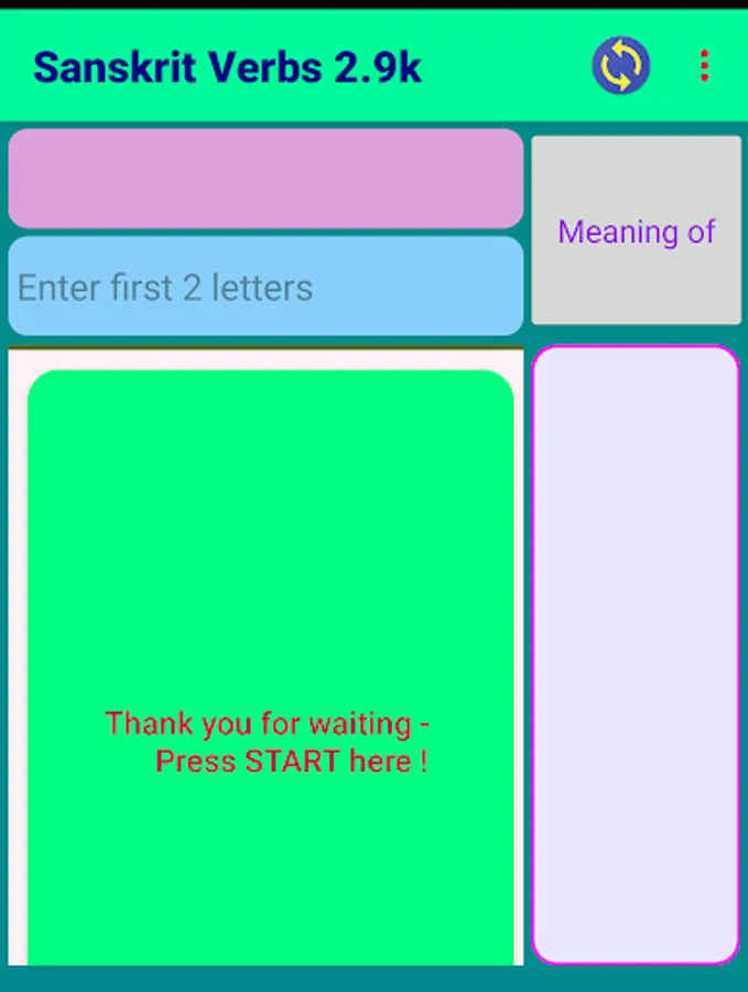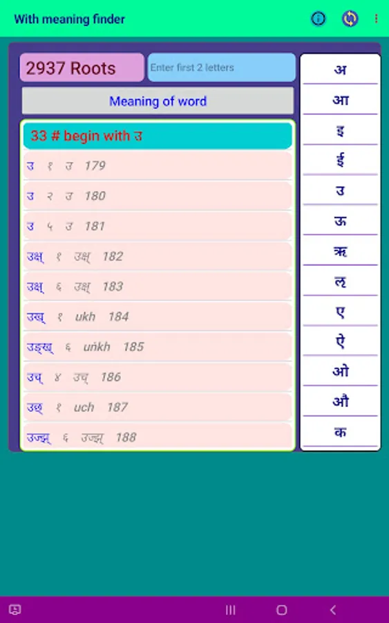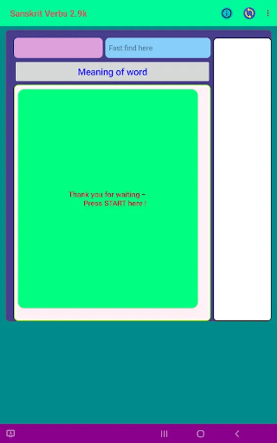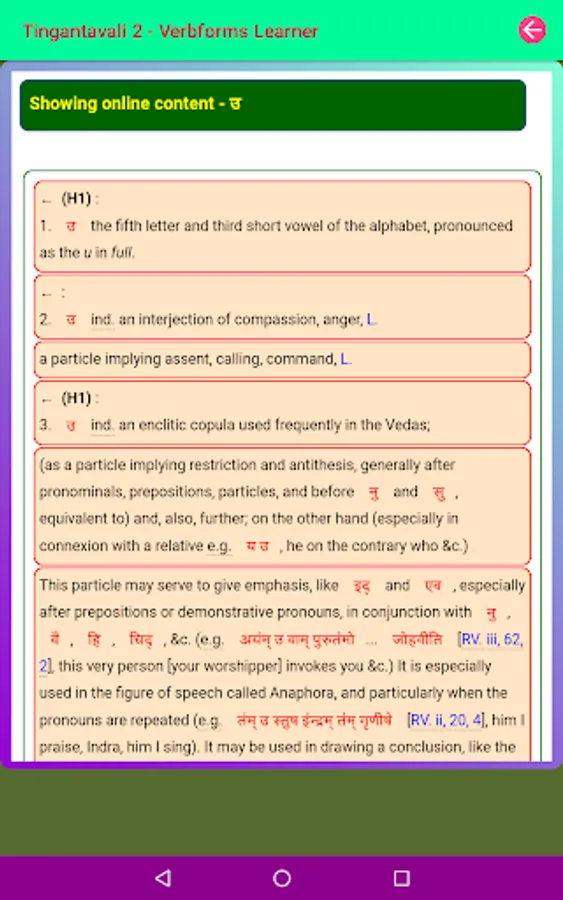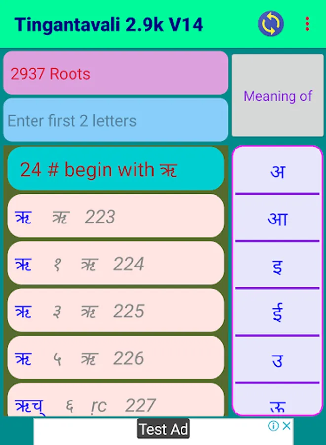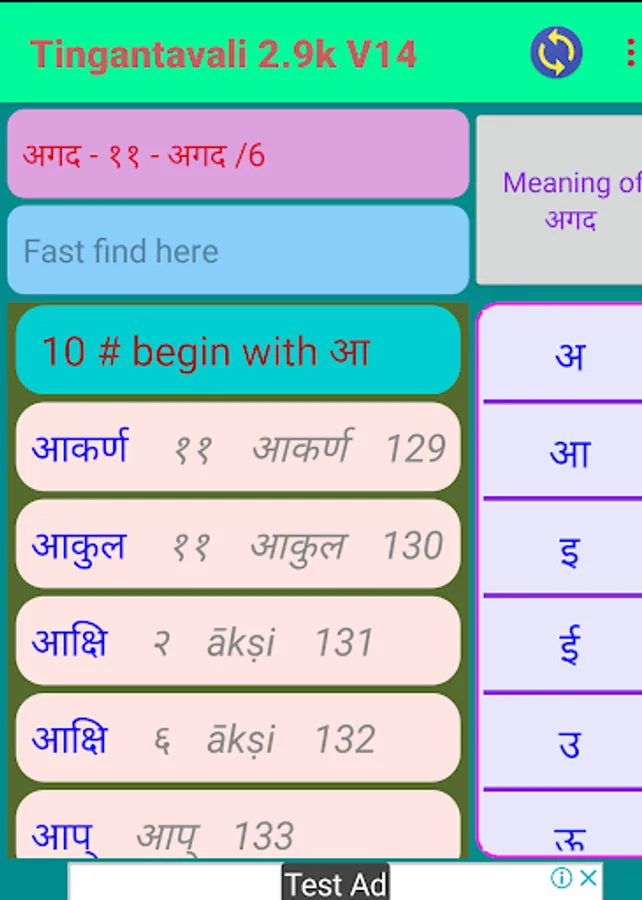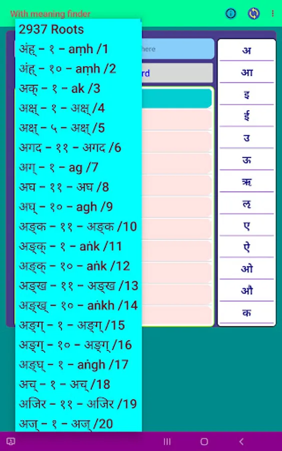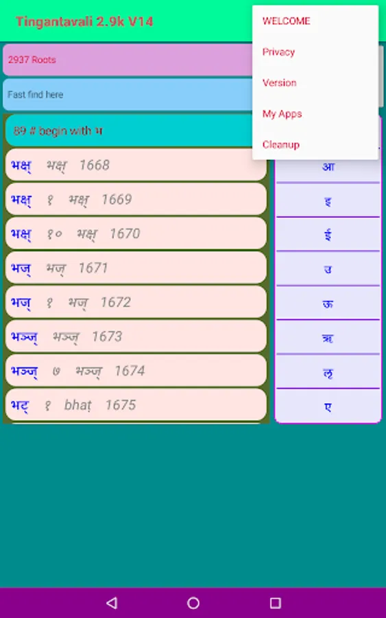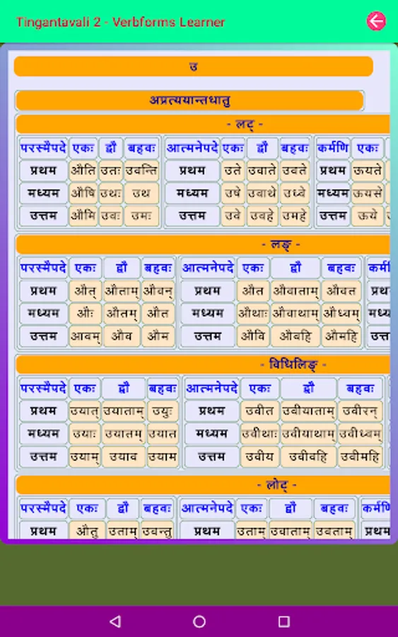 This App 'Sanskrit Tingantavali Shikshaka 2' is another trainer for Sanskrit verb forms or declensions in a tabular format. A simpler interface to choose the root word from the list, which is easy to use.