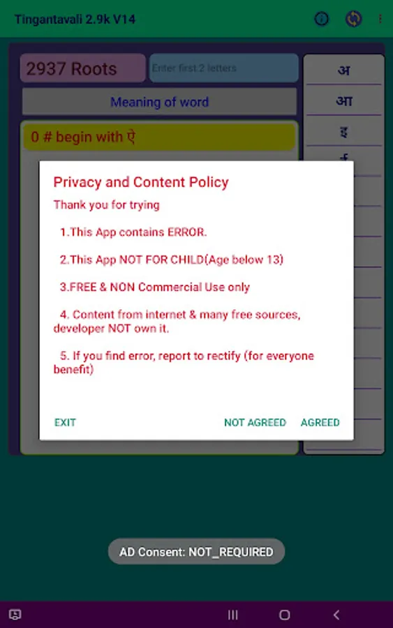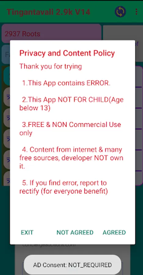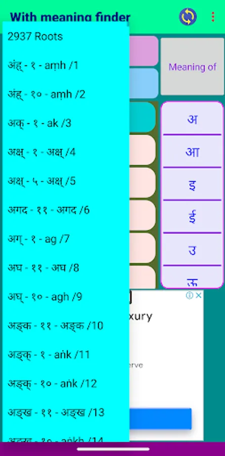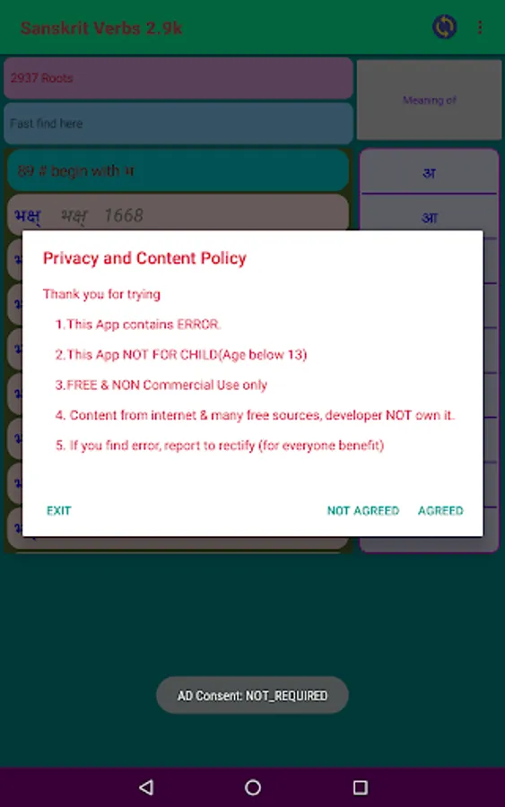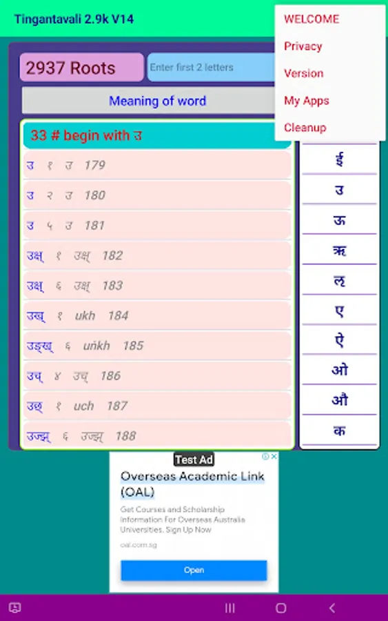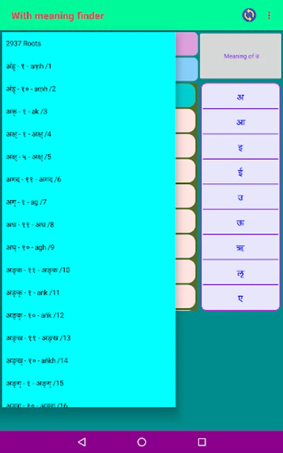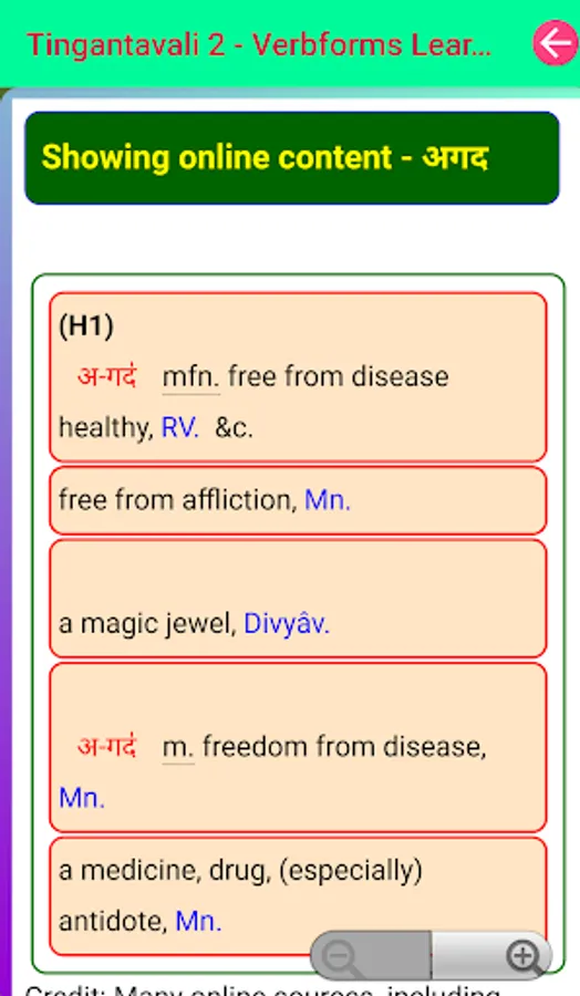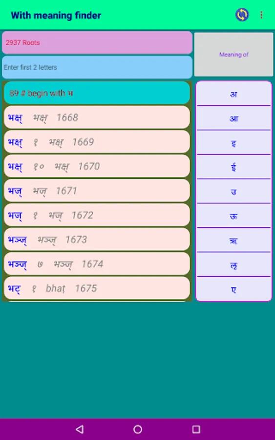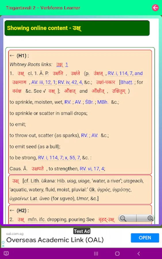 This App 'Sanskrit Tingantavali Shikshaka 2' is another trainer for Sanskrit verb forms or declensions in a tabular format. A simpler interface to choose the root word from the list, which is easy to use.