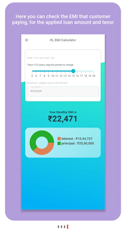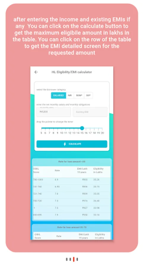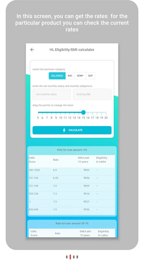 No need to worry about the maximum eligible loan limit of the customer and the emi for a requested tenor, while you are at customer visit, just open the app, select the type of product , enter the salary/ annual income to get the maximum eligible loan amount. click on the table to get the emi details.
