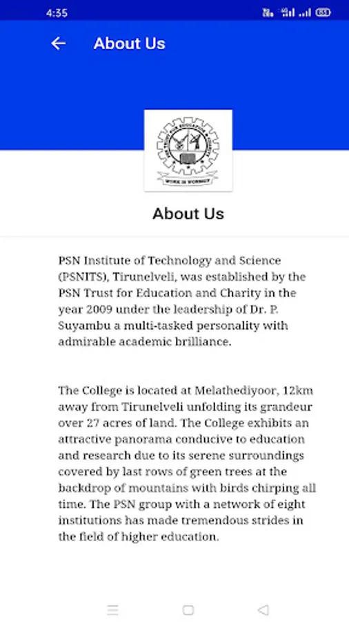 PSN Institute of Technology and Science (PSNITS), Tirunelveli, was established by the PSN Trust for Education and Charity in 2009 under the leadership of Dr P. Suyambu a multi-tasked personality with admirable academic brilliance.