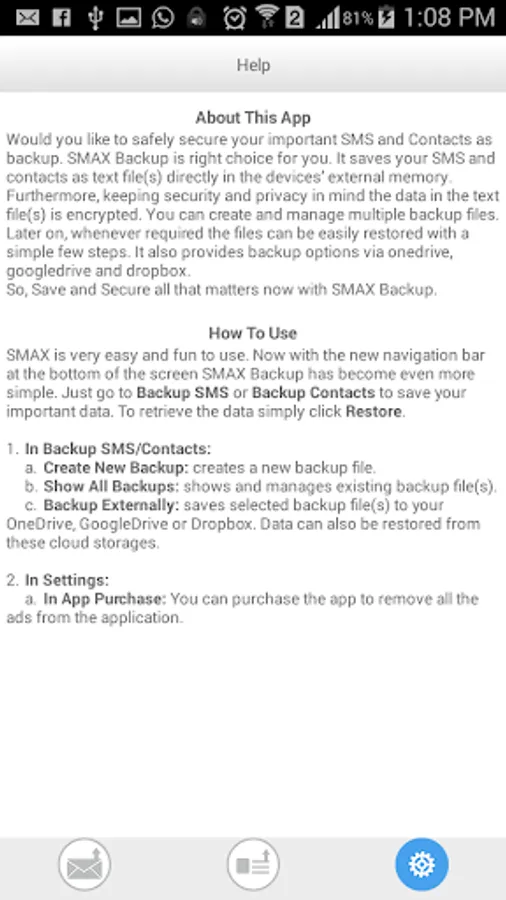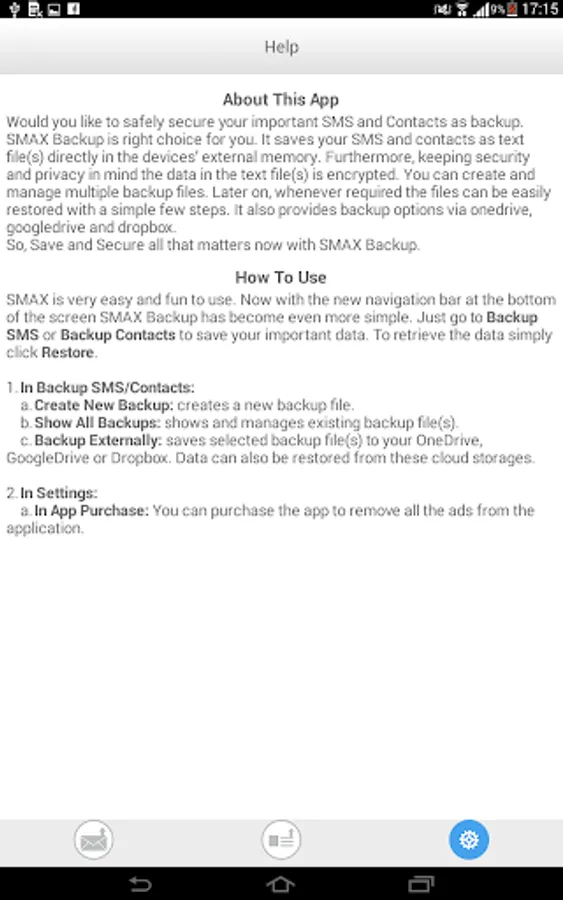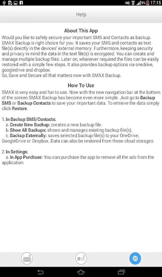 Would you like to safely secure your important SMS and Contacts as backup. SMAX is the right choice for you. It saves your SMS and contacts as text file(s) directly in the devices’ external memory. Furthermore, keeping security and privacy in mind the data in the text file(s) is encrypted. You can create and manage multiple backup files. Later on, whenever required the files can be easily restored with a simple few steps. SMAX also maintains a log of the backup file(s) updated and restored. It also provides backup options via email and dropbox.