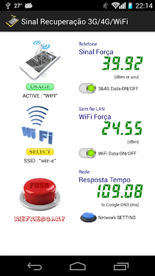 (2) signal strength 3G / 4G / LTE / WiFi network and a response are measured in real time. (Network response time Ping time to Google DNS.)