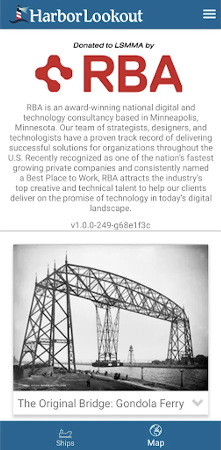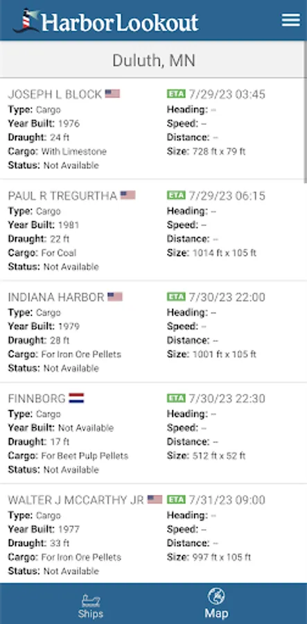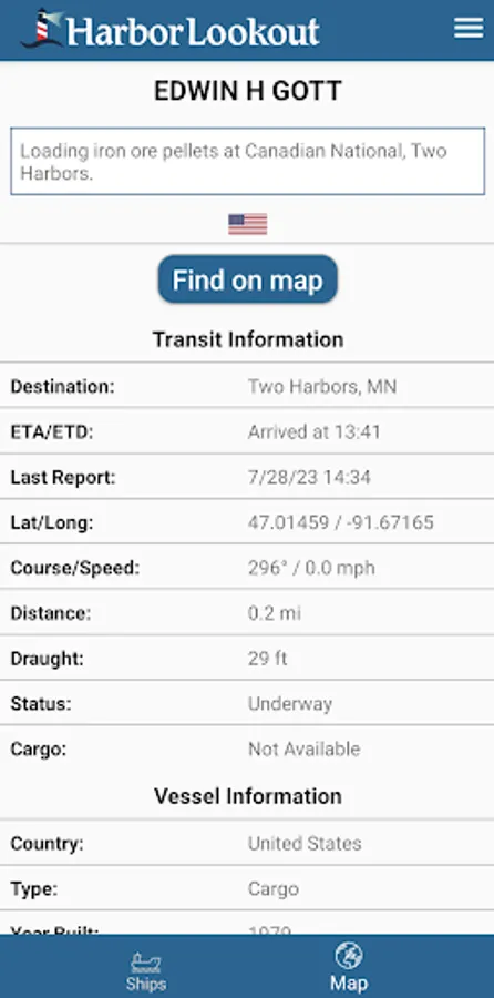 This application provides live information about ships in the Twin Ports and vicinity (Duluth, Two Harbors and Silver Bay, Minnesota and Superior, Wisconsin). You can list ships arriving and departing. You'll find information such as Destination, Country of Origin, Cargo, Speed, and more. Live map is a cool feature which shows the locations of these fascinating ships. You can select home port for easy viewing of information on ships coming and going from your favorite port. Want to witness the famous Aerial Lift bridge in action? Use Harbor Lookout information to help estimate when the bridge will be raised or lowered.