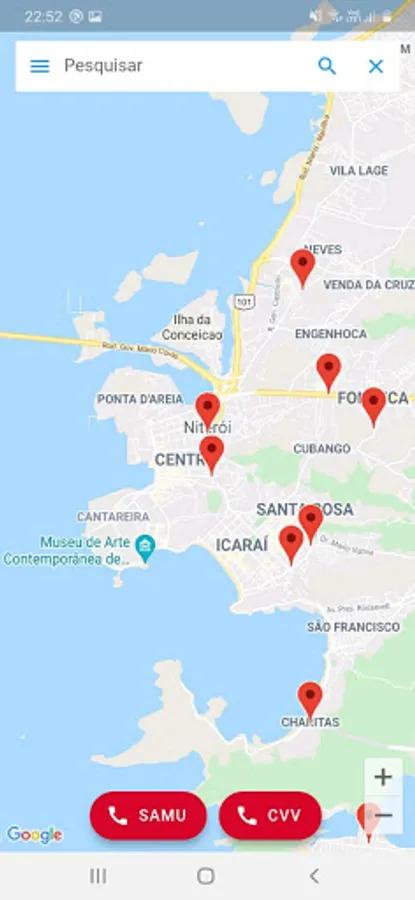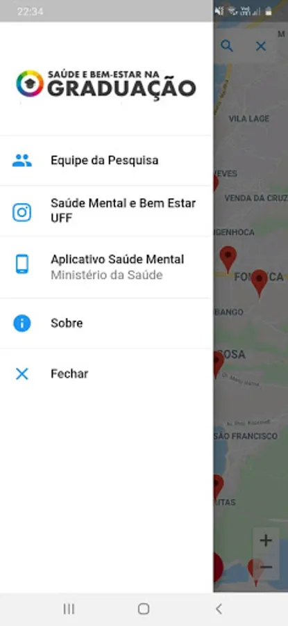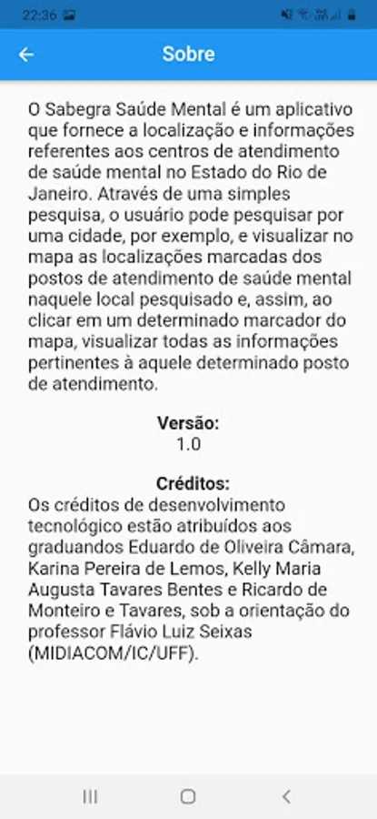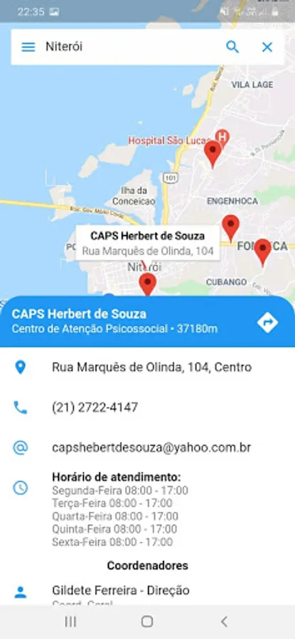 The Sabegra Mental Health app provides a search feature for the user to search for a city and thus visualize on the main screen of the app a map with the marked locations of mental health care centers in that searched location. Thus, providing the identification of the location and information of mental health centers across the state of Rio de Janeiro.