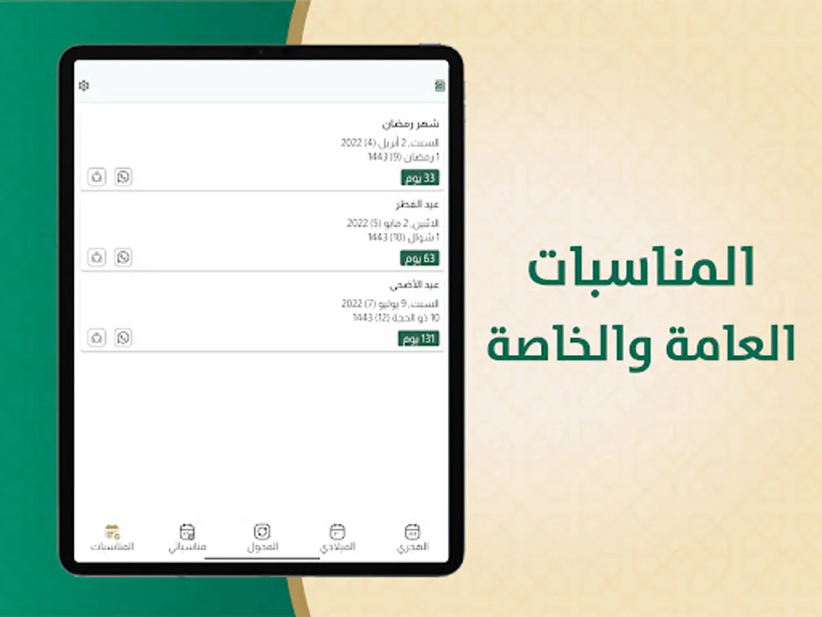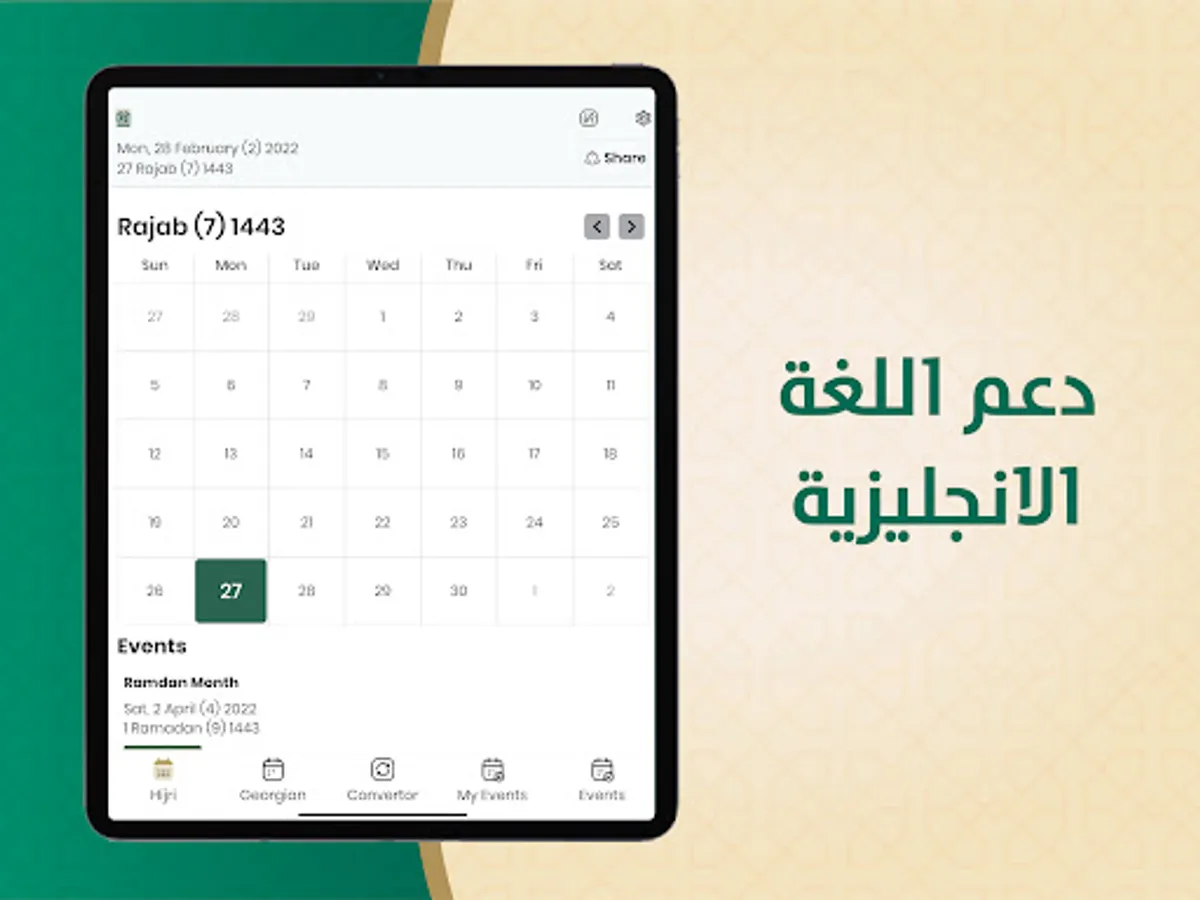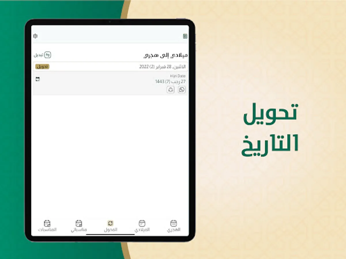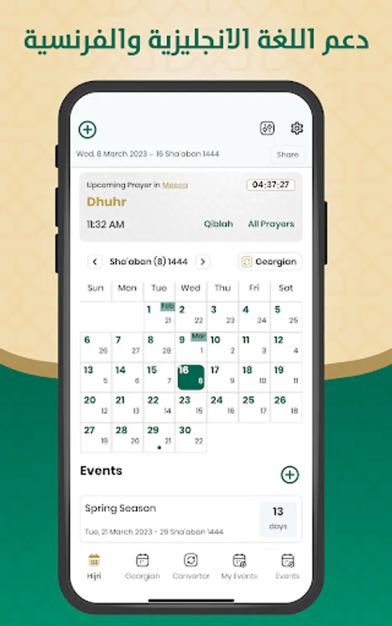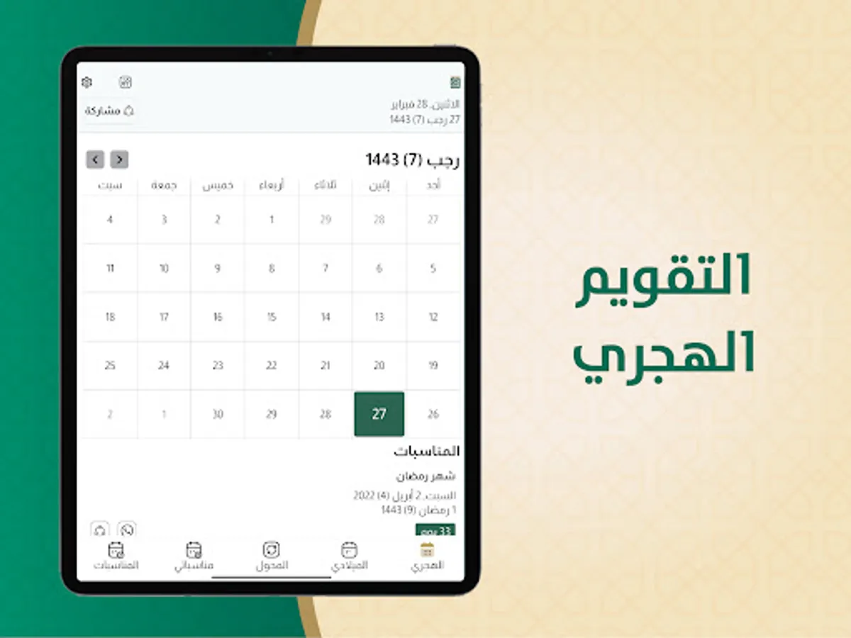 The Hijri and Gregorian calendar application displays: