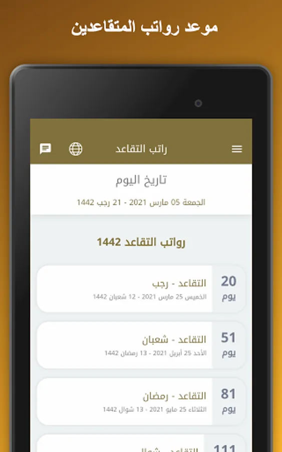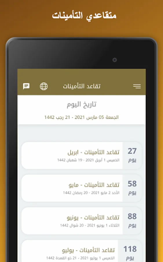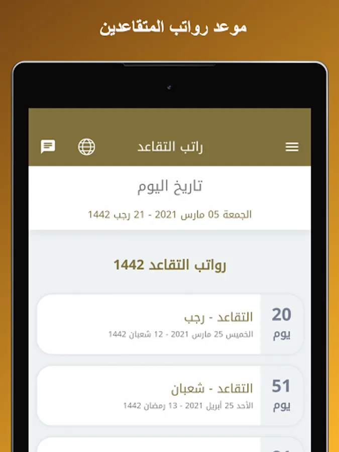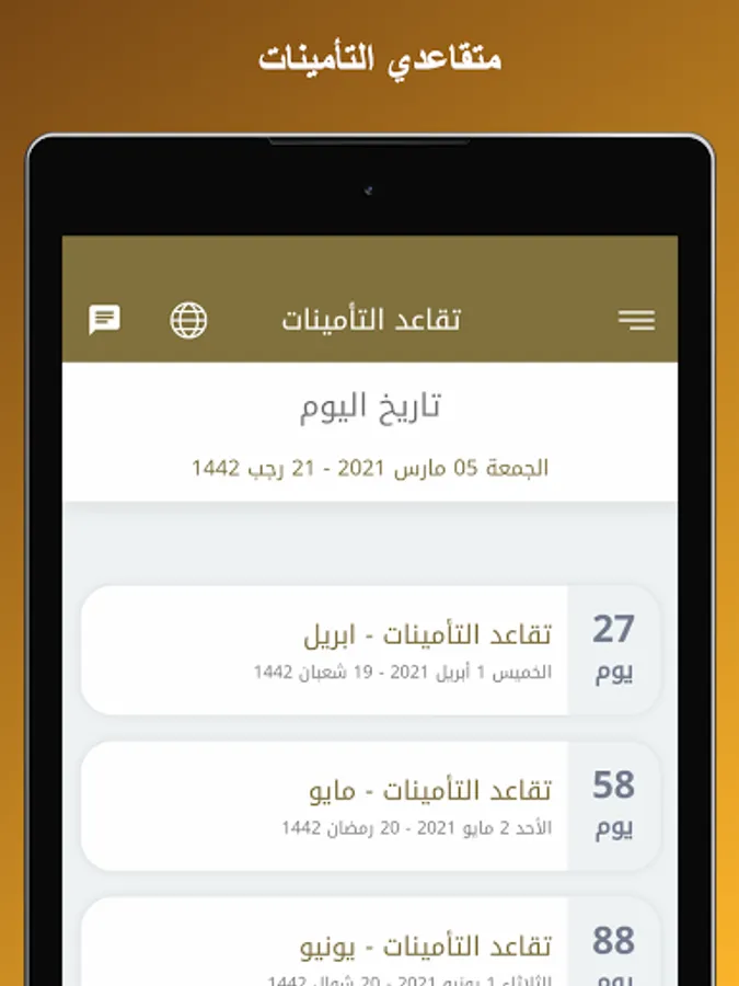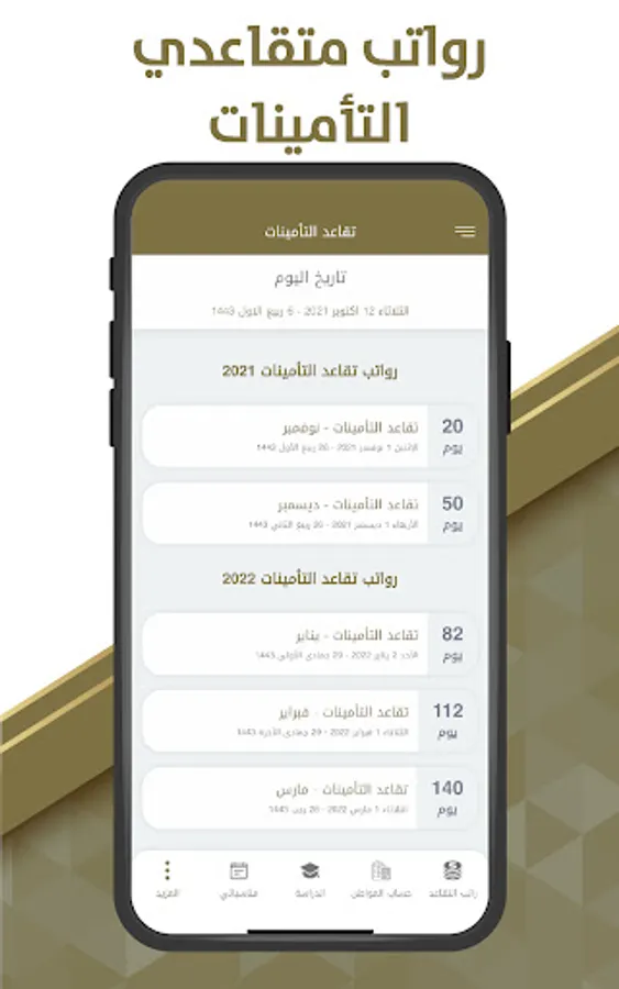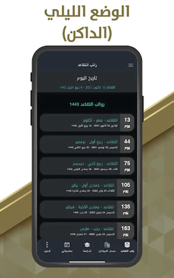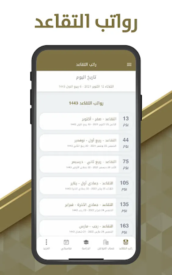The retirement salaries application reminds you of the date of disbursing salaries to retirees in Saudi Arabia according to the Gregorian date (the 25th of each Gregorian month) and what corresponds to the Hijri date.