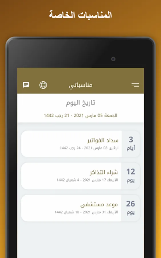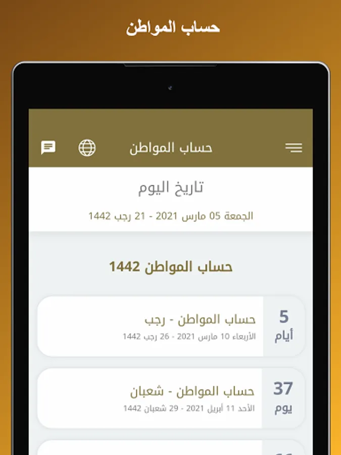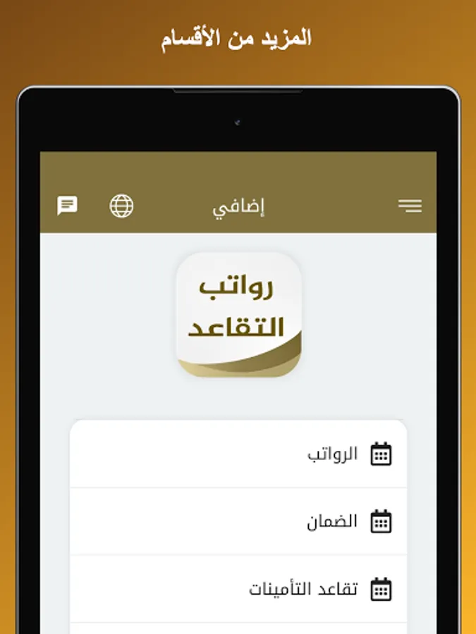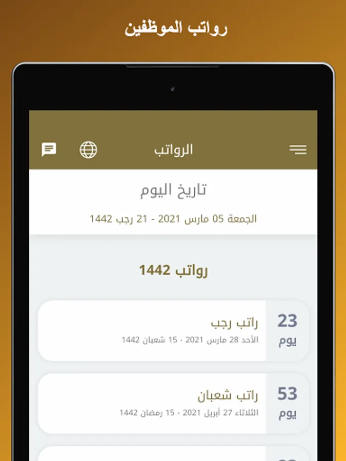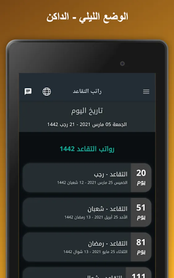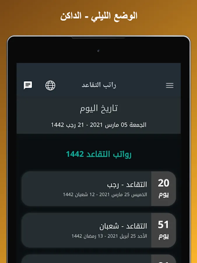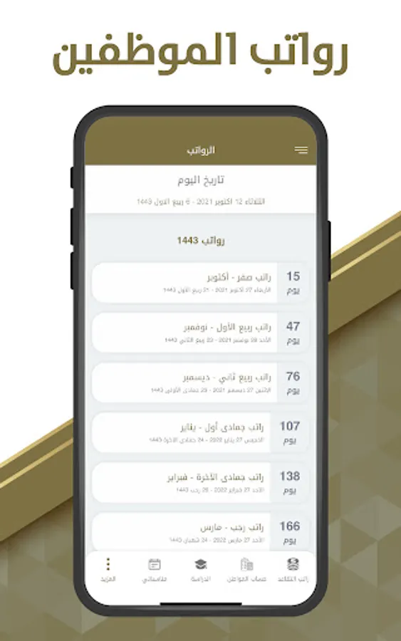 The retirement salaries application reminds you of the date of disbursing salaries to retirees in Saudi Arabia according to the Gregorian date (the 25th of each Gregorian month) and what corresponds to the Hijri date.