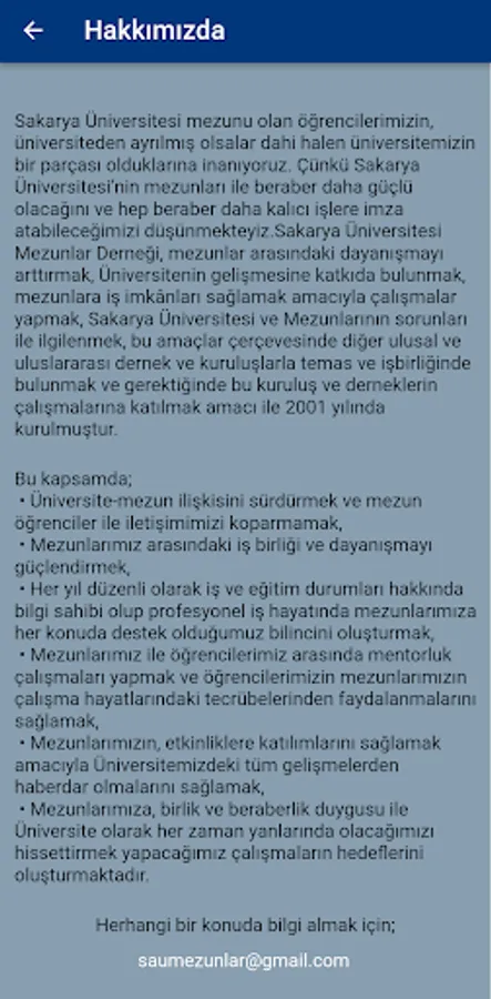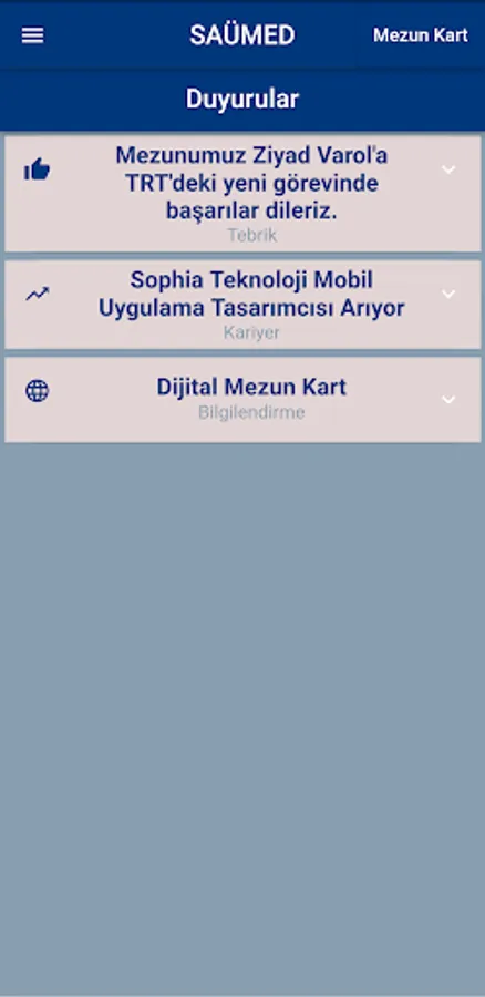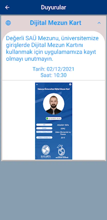 This application, by Sakarya University Alumni Association, offers a graduate card that SAU graduates can use to enter our university. In addition, career announcements for our graduates looking for a job, congratulatory announcements for graduates who have started a new position, and event announcements are also included in the application.
