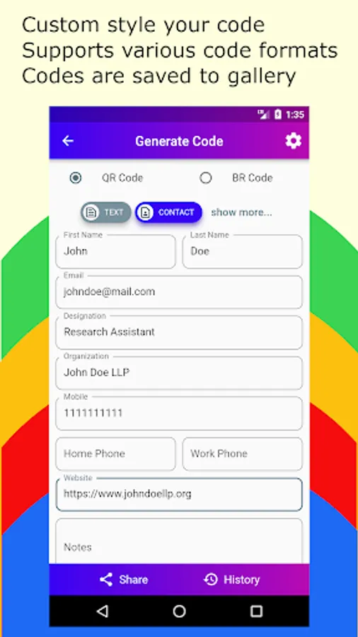 * Generate QR code for text, contact, wifi, phone, sms, url and email with many more to come