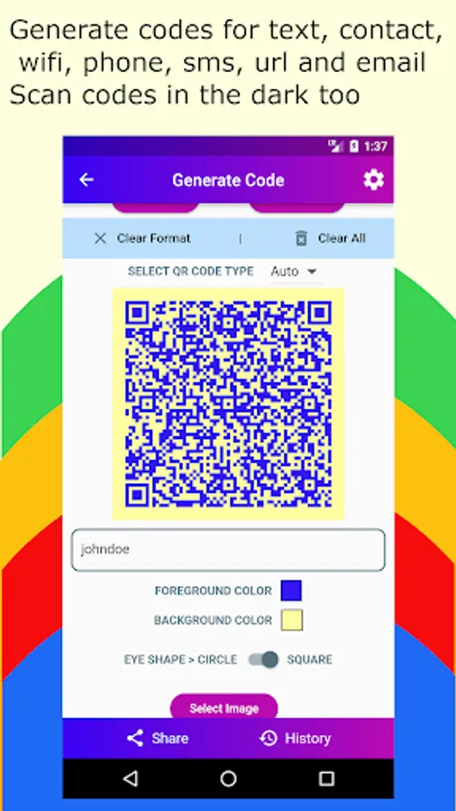 To generate a QR code or Barcode, select the GENERATE CODE option and then choose between QR code or Barcode generation. If you have chosen QR Code, you can select additional options such as to generate code for Text, Contact, WIFI, SMS, URL and PHONE with many more to come. Next, click on PREVIEW to see the code. You know have the option to style the background or foreground color of the code and to change the eye shape of the code. You can also add an image overlay to the code. You can also change the QR code or Barcode formats. Once you have finalized the code, click on GENERATE to generate the code. This will save the code in your image gallery and in history for easy reference later. You can also directly share the code through email, etc