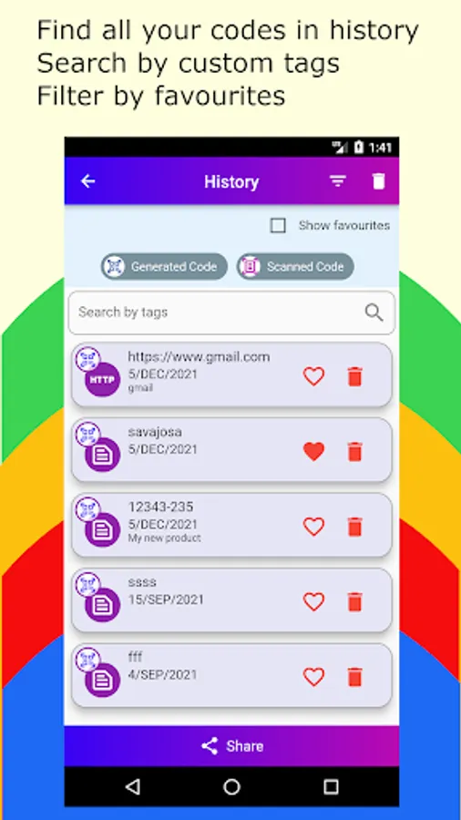 Go to the history screen to see all the codes that you have Generated and /or Scanned. You can delete a code if you no longer need it or delete all the codes at once using the delete options given. Want to set a code as your Favorite? Click on the heart symbol. Are there too many codes to view, use the filter option and narrow down to your Generated or Scanned or Favorite codes. Narrow it down further by searching through the tagged codes. Do you want to see the details of a code? Tap on it to see the same. Easily visualize between the Generated and Scanned codes using the icons.