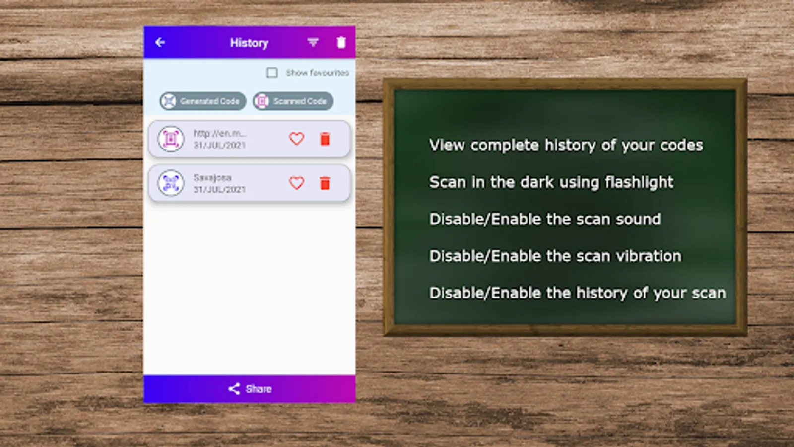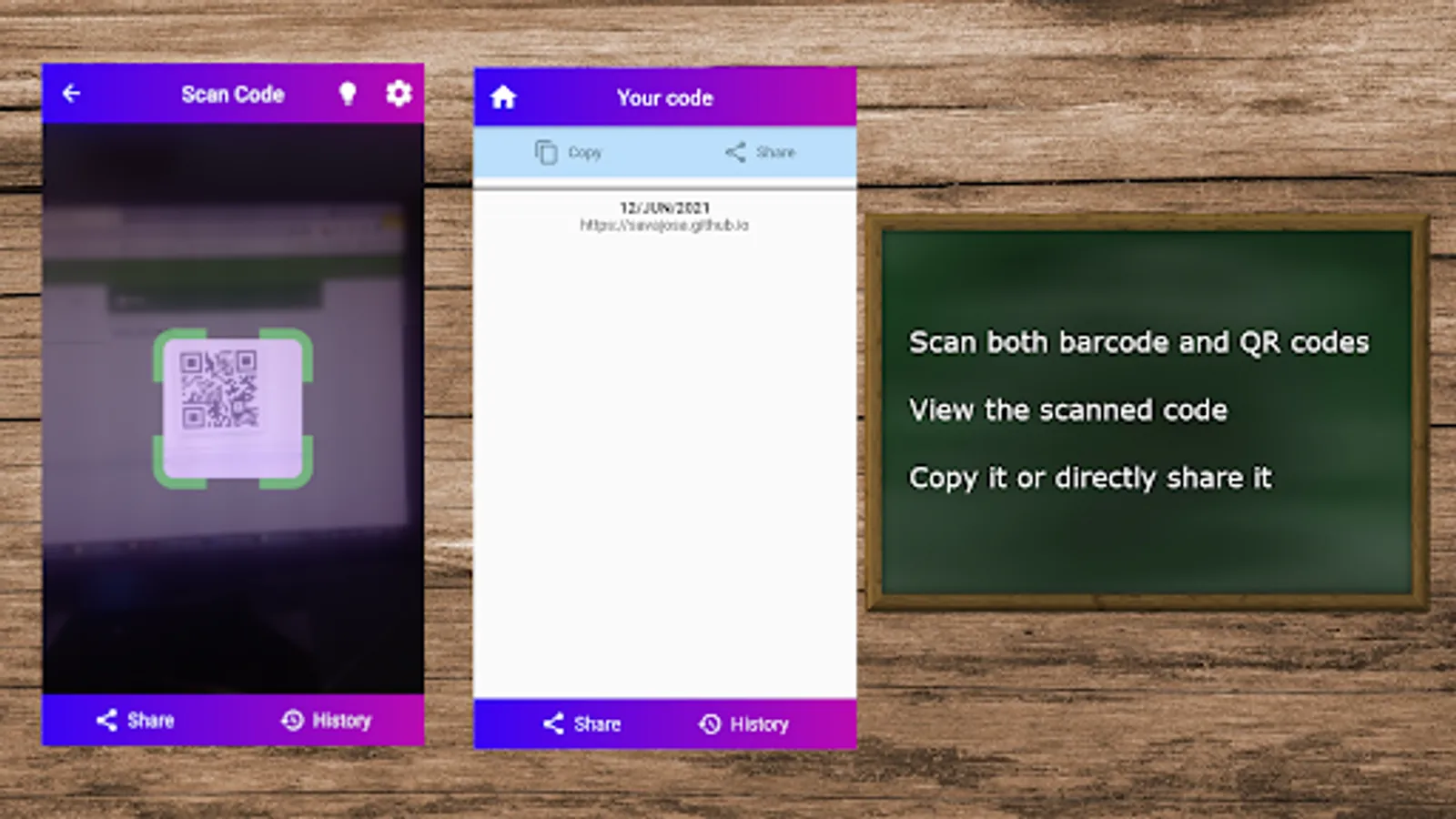 * Copy the scanned code or generated code to use it elsewhere or share it directly through email, etc