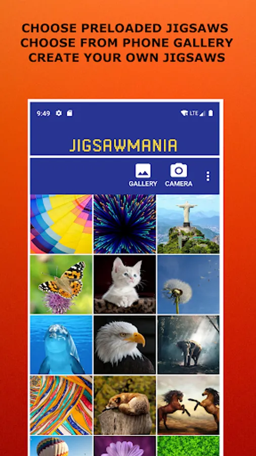 It comes preloaded with images of various themes. You can also choose images from your phone gallery or create a new jigsaw through your phones camera to create unlimited jigsaw!
