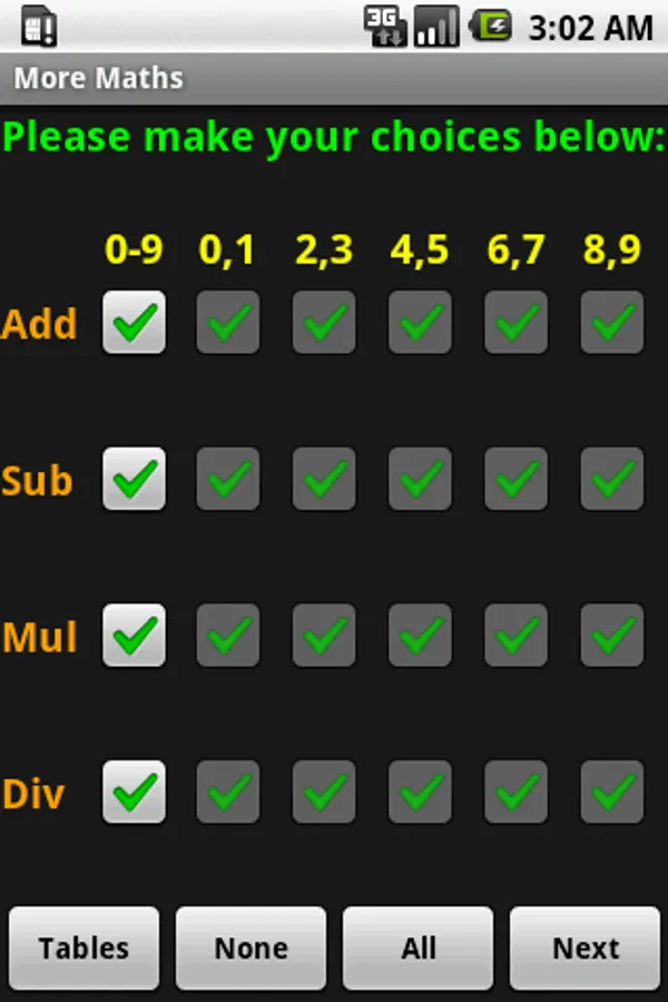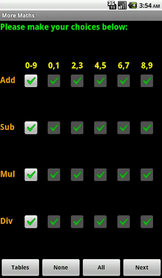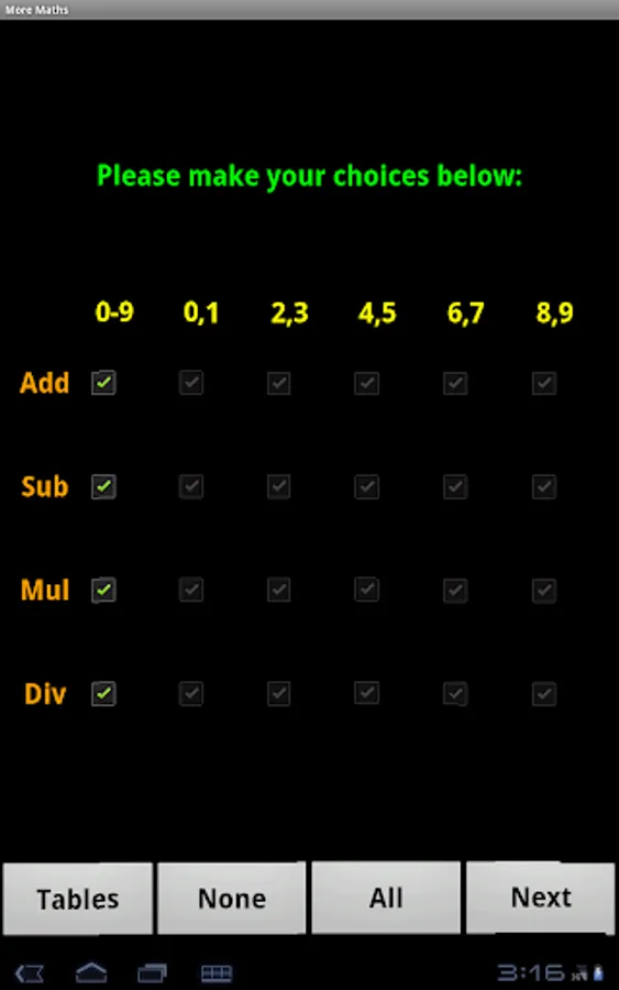 - If you want to try addition with 0 to 9 then check the box (“0 to 9”) next to “Add”, this will check the rest of the boxes for you in this row.