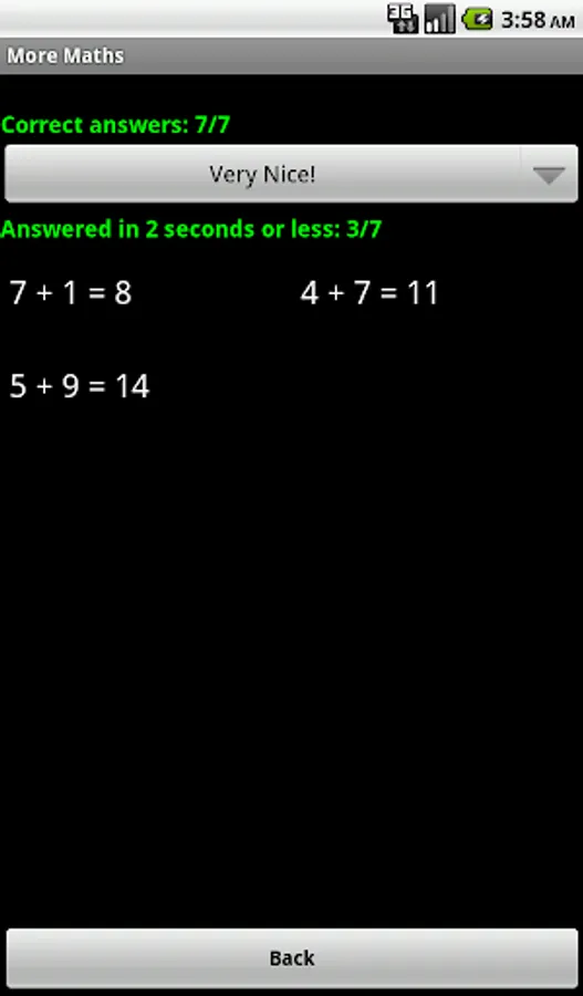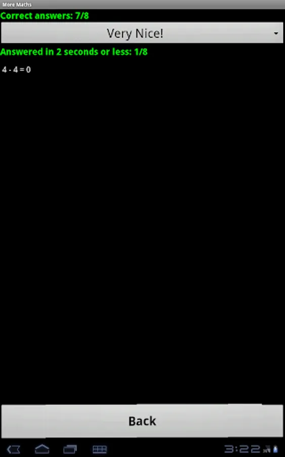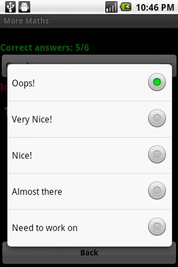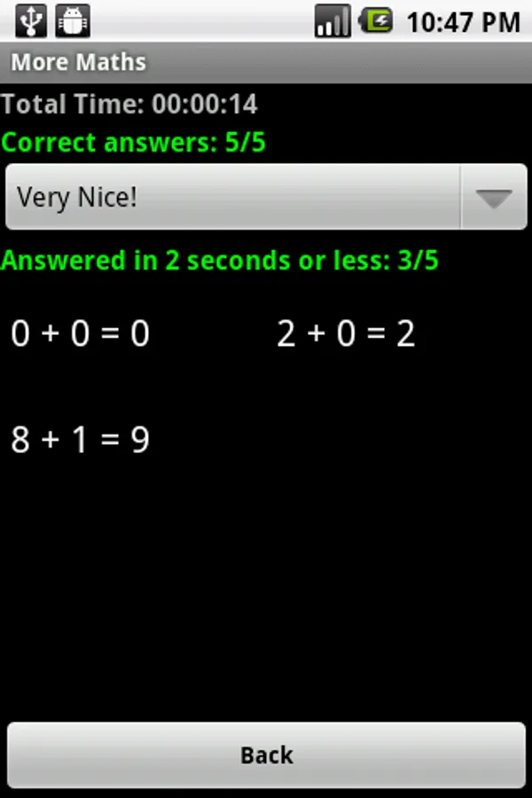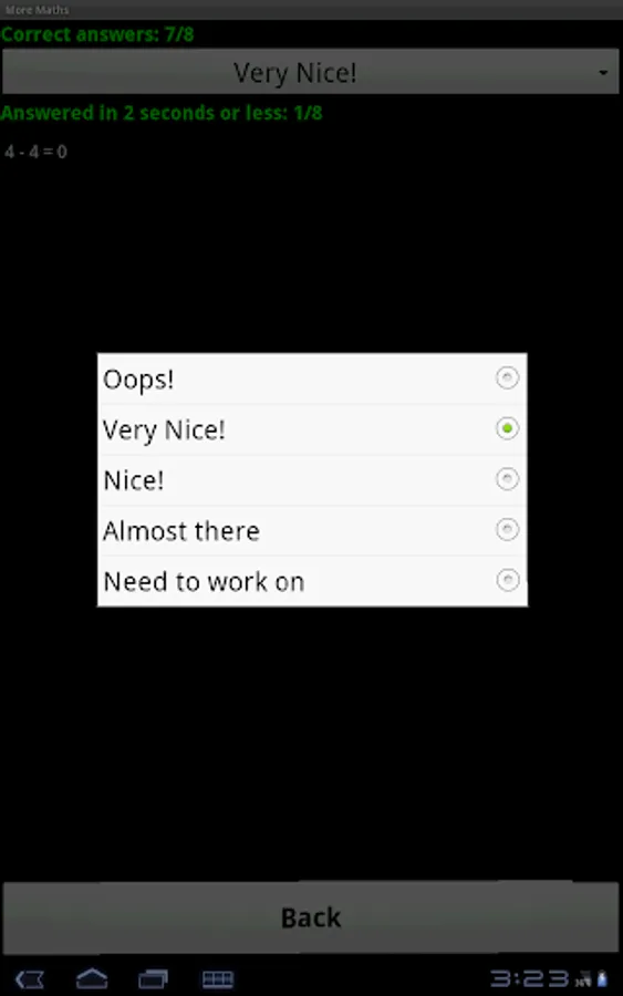 - Results are divided in: Oops (incorrect answers), Very Nice! (Answered in 2 seconds or less), Nice (Answered in 2 to 5 seconds or less), Almost there (Answered in 6 to 10 seconds), Need to work on (Took more than 10 seconds).