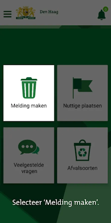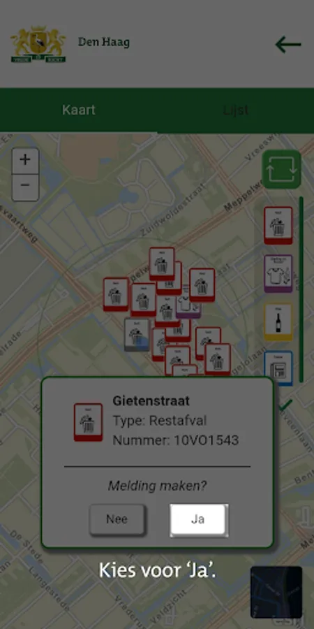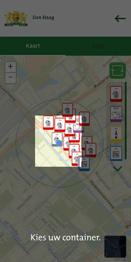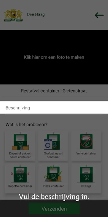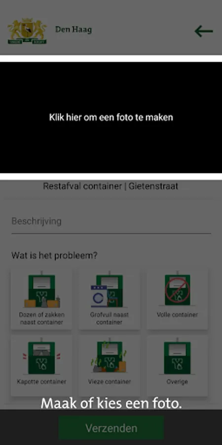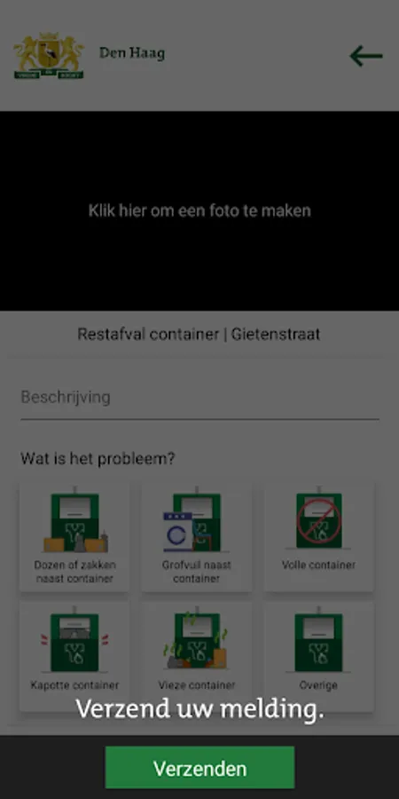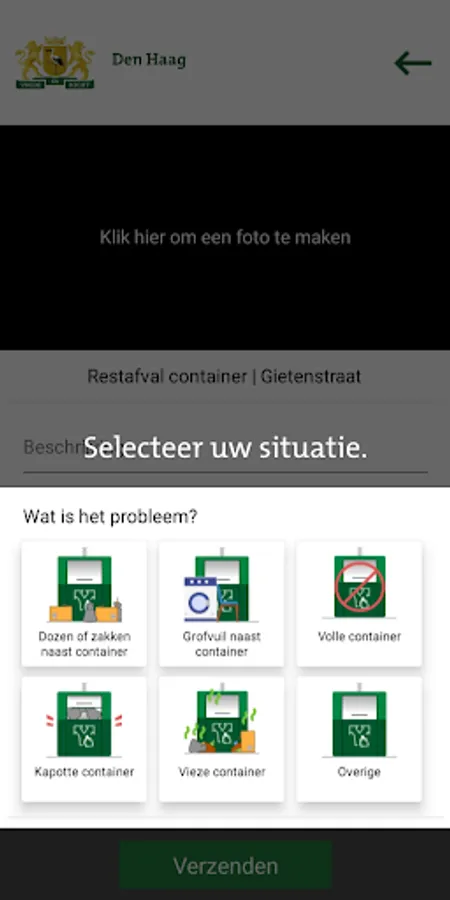 1. Melding maken: problemen rondom containers voor restafval, kleding en textiel, papier en glas doorgeven aan de gemeente Den Haag (van bijplaatsingen tot volle, vieze en kapotte containers).