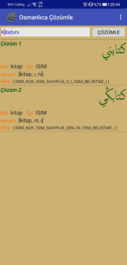 The Ottoman Solution application performs morphological (structural) analysis of Turkish words and lists all possible solutions by separating them into root and suffixes, and also shows the Ottoman spelling of these solutions. Because, depending on the structure of the word, the Ottoman spelling may be different.