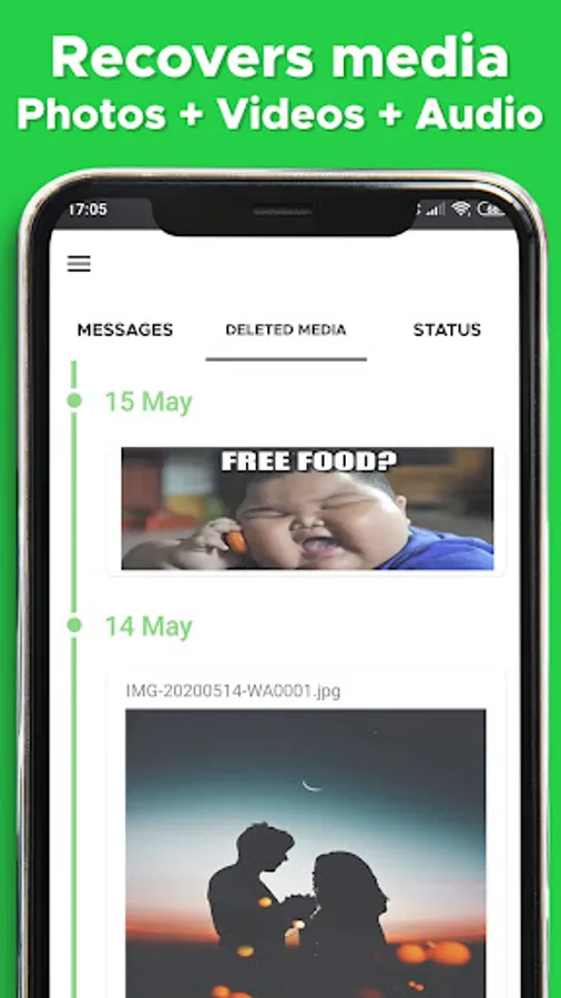 ChatSave is a free tool that allow you to recover deleted chat text messages (Whatsapp, Messenger ecc..) and also any media attachment,download status, read messages without blue marks.