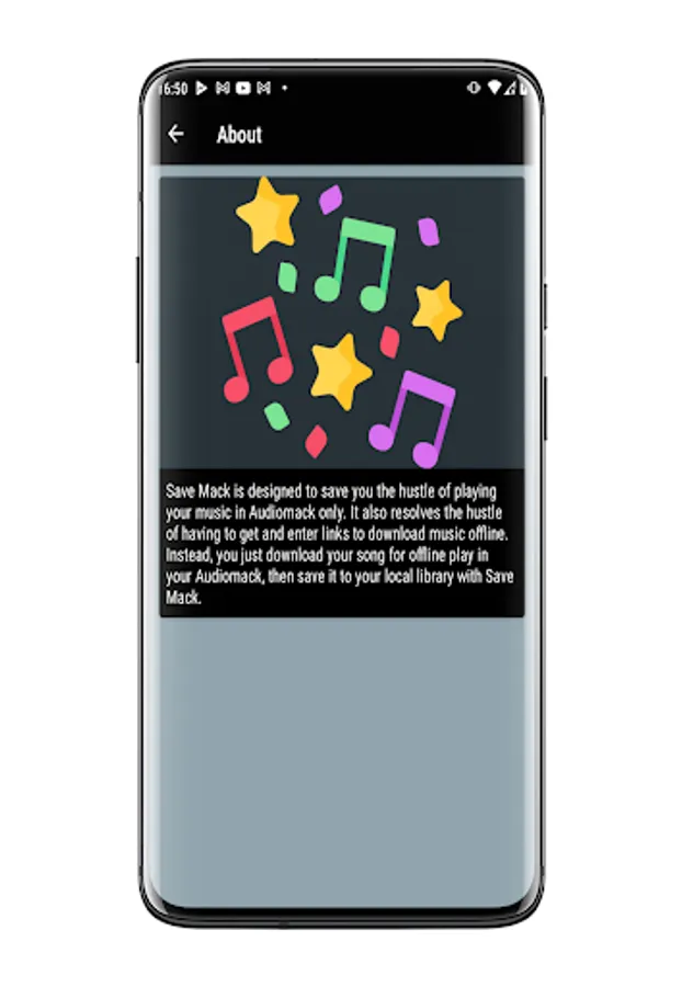 Save Mack allows you to save songs you download in your Audiomack app to your phone so that you can have acces to them with any media player of your choice and at anytime