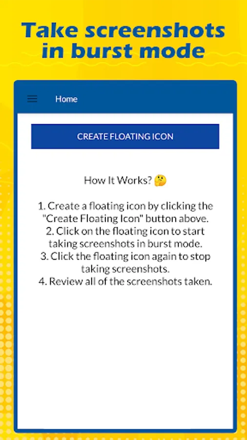 If you don't like our floating icon mode, we also offer pro mode which you can access via our app. Our latest update offers a fast save function too. BTW you would be required to keep screen on for burst mode screenshots. Add now this wonderful app to your phone.