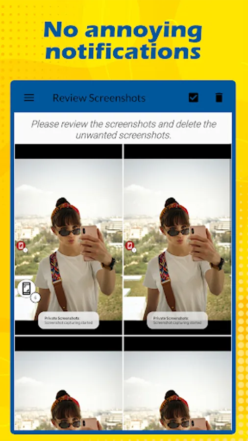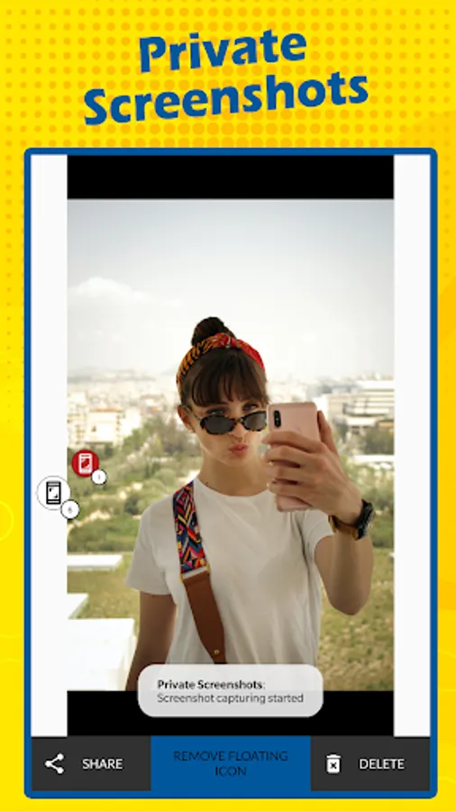 The app ensures complete privacy as all the screenshots taken by you are stored in the "Private Screenshots" Folder on your device. We are almost broke and can't afford servers so we don't keep your screenshots on our server and respect your privacy completely. So, all your screenshots are kept confidential with you and hidden from others.