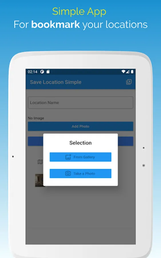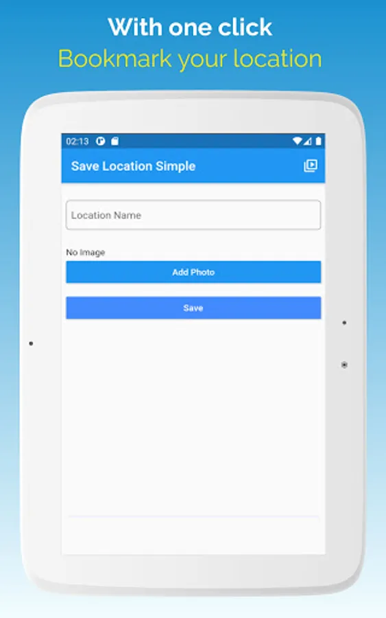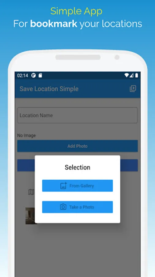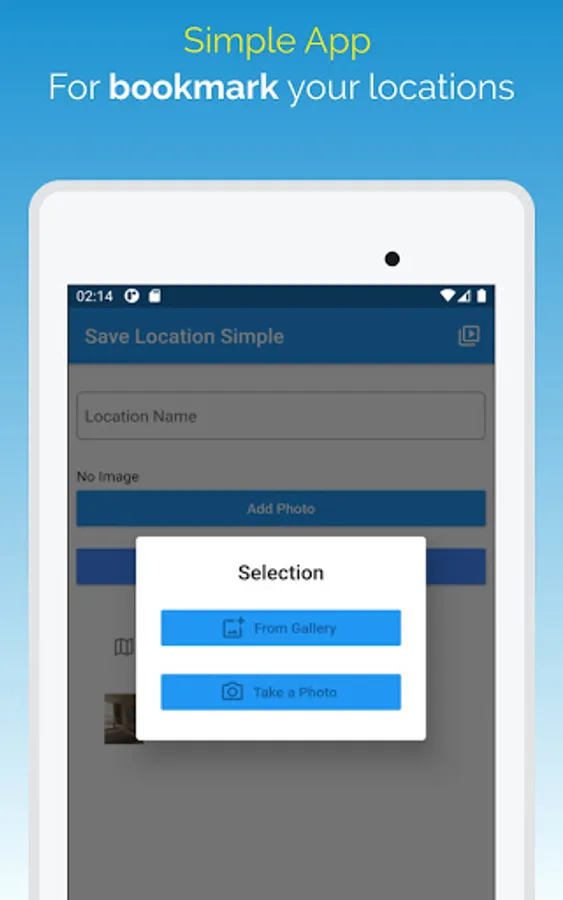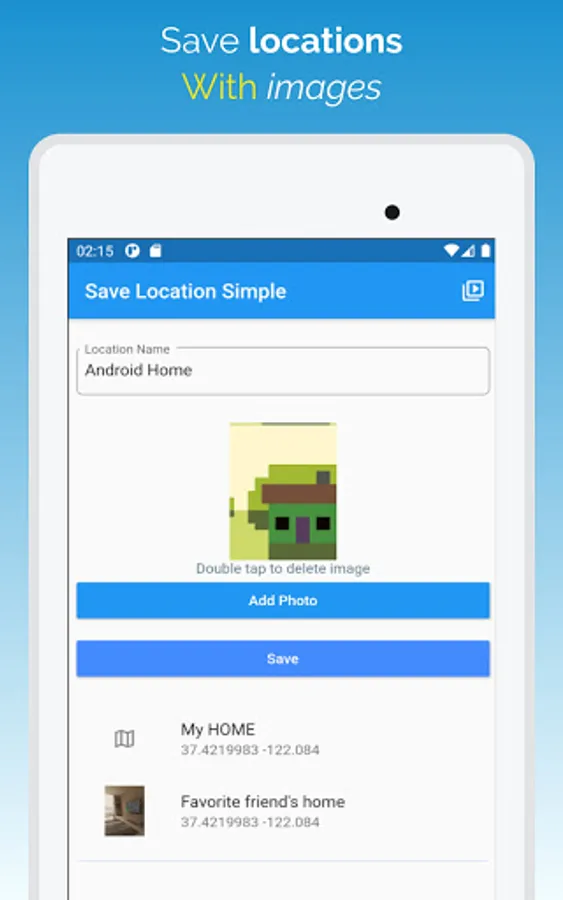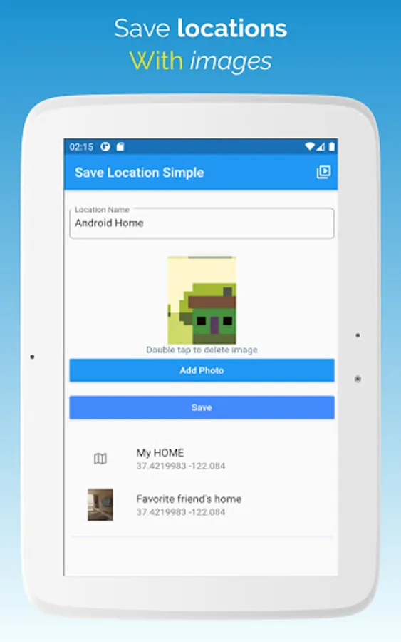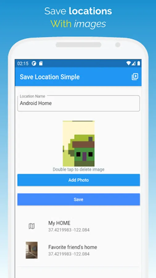 User can save current location and can add photo describes location. Saved locations will be listed with title picture and latitude/longitude of location.