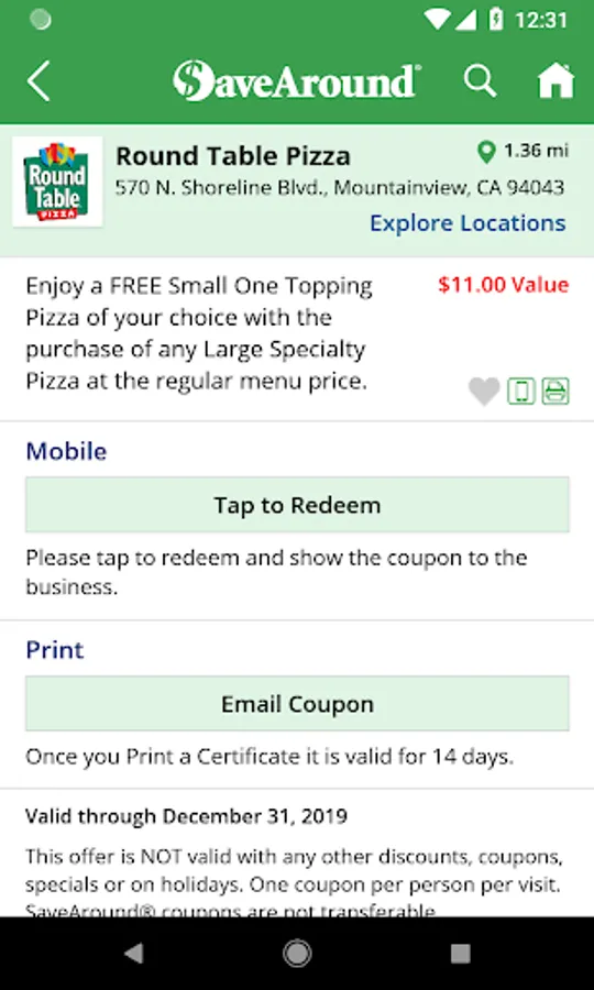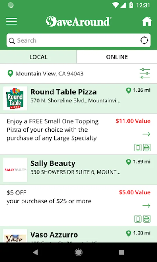 SaveAround’s Mobile Application offers access to a collection of coupons that can be redeemed with merchants in your geographic area (and in some cases online). By using the Mobile Application, as opposed to buying a hard-copy coupon book, you can choose how long you would like access to the coupon collection. We offer subscriptions ranging from 1 month to 1 year. Coupons are valid from January 1 throughout December 31 of each year. There may be multiple copies of some coupons in the collection, while for other coupons in the collection there is only one coupon that may be redeemed during the calendar year. Each January 1, the coupons in the collection are either renewed and can be used again or will be replaced by coupons from other merchants.