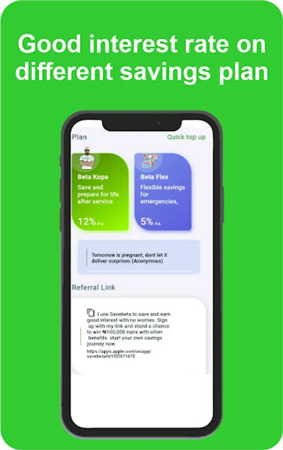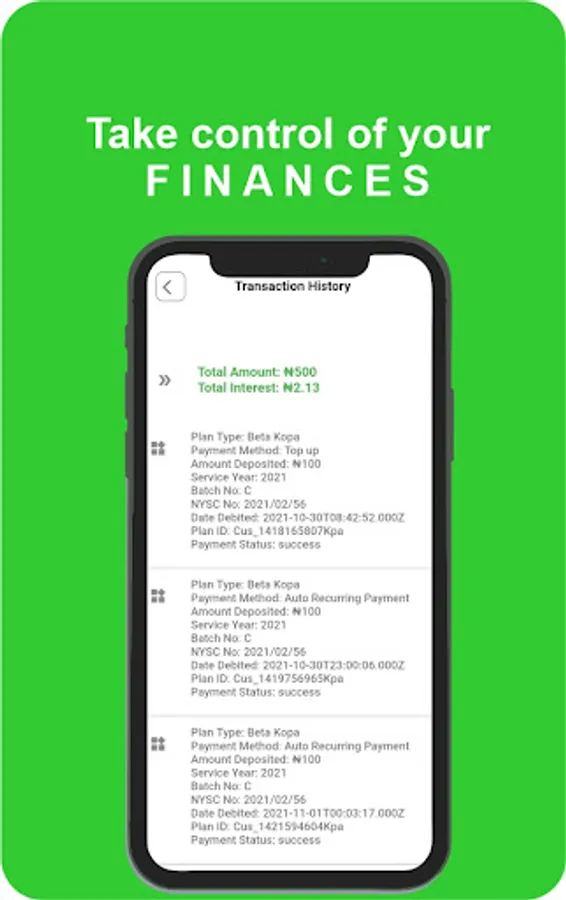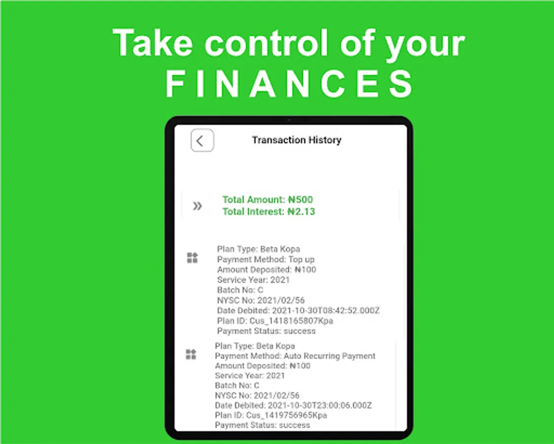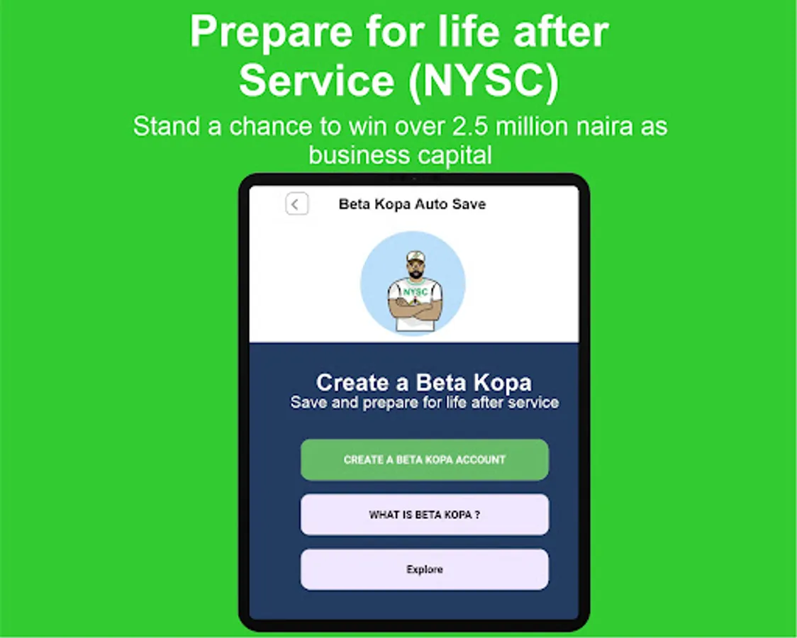 Beta kopa account helps you prepare for life after NYSC and also give you a chance to win over 2.5million naira as business startup capital after your service year if you are able to save a minimum of N10,000 monthly for 12months.