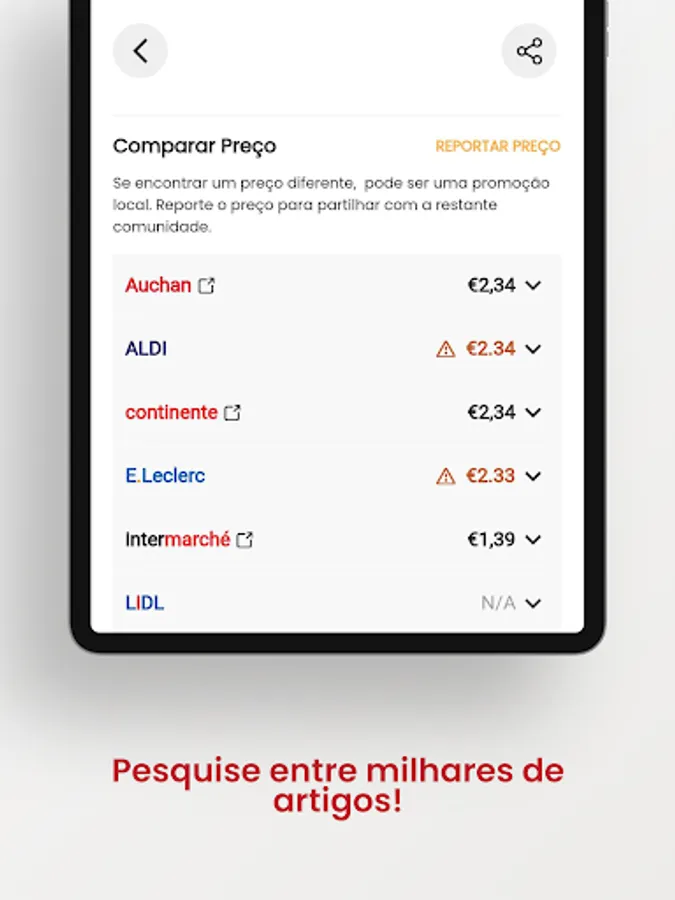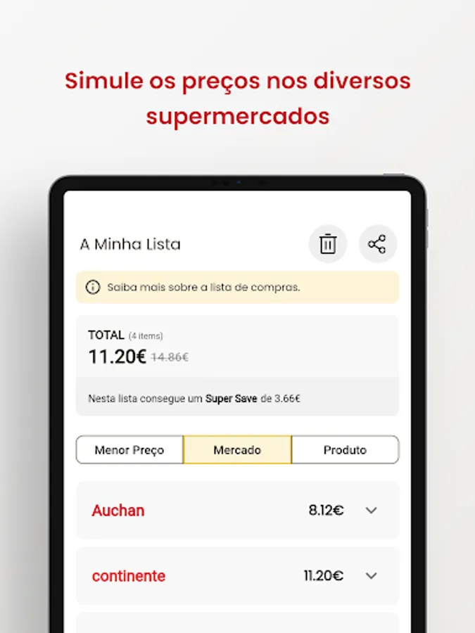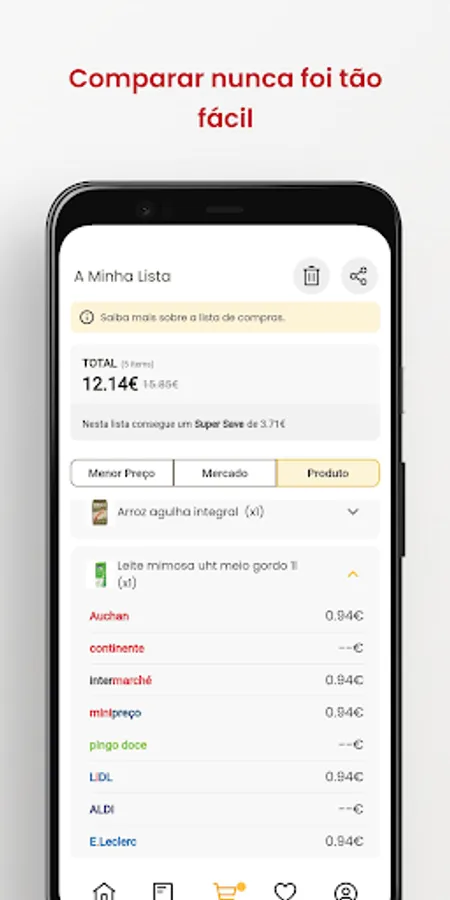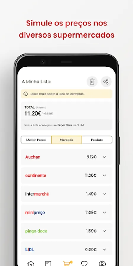 We present the Super Save app, the new price comparator between different supermarkets. Search among the thousands of articles in the Auchan, Minipreço, Continente, Pingo Doce and Intermarche chains and make the best decision for your pocket.