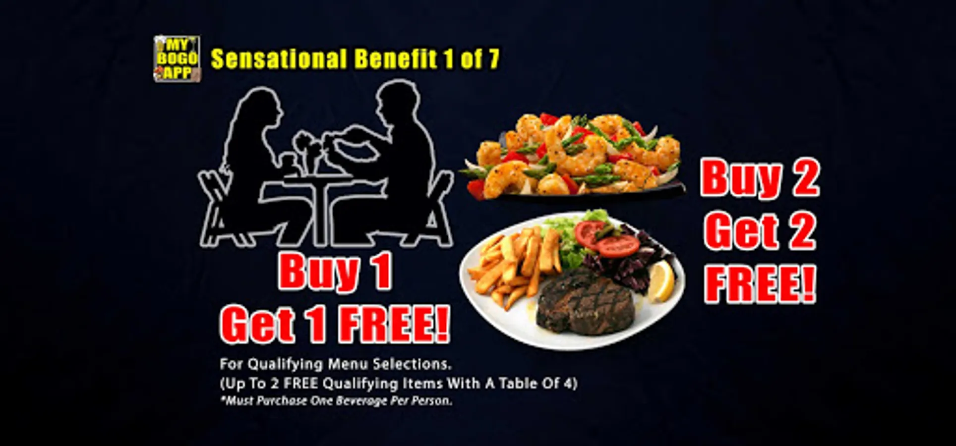 You can choose either a Buy One, Get One FREE for any Qualifying Menu item listed for each restaurant (www.BOGOMenus.com), up to TWO FREE Qualifying Menu Items with a table of 4 OR Get 3 Half Price Drinks at your favorite restaurant or bar.