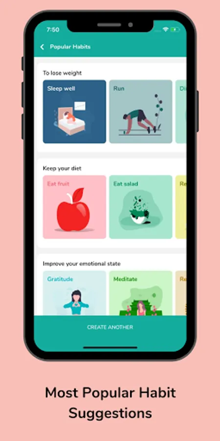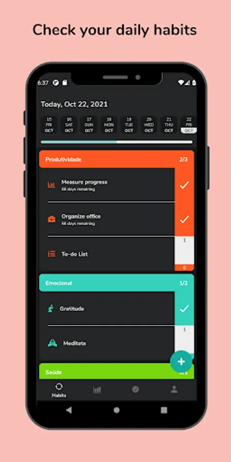Goal tracker categories are exceptional to define a better view of the areas and habits in which you are working: Productivity, Health, Emotional ... Habitude allows you to define a name and color for each category, this makes your habits become much more organized