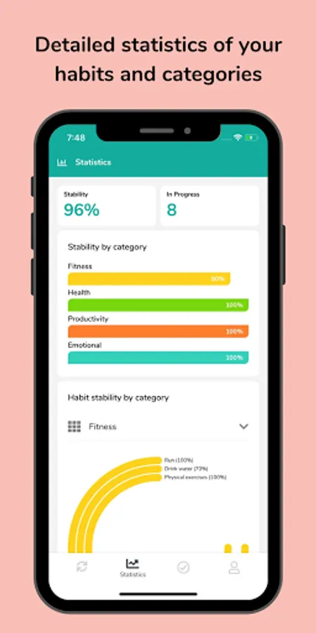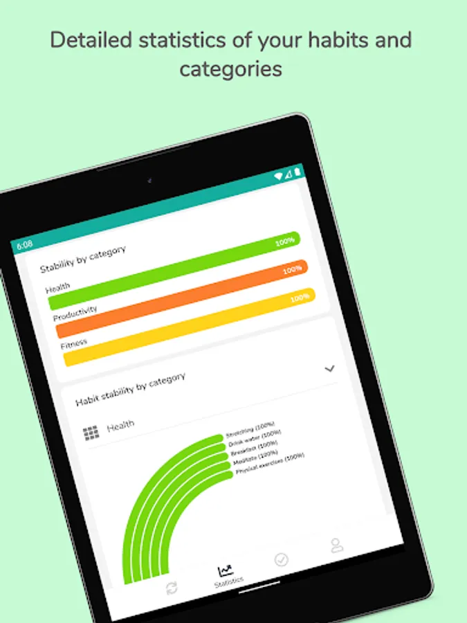 Habitude has a built-in goal tracker which helps you with useful statistics. Statistics are great for you to track your progress. Habitude offers individual statistics for each habit and also for its categories. Measuring your progress is great for being on the move and motivated to achieve your goals.