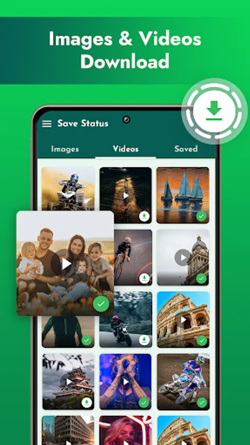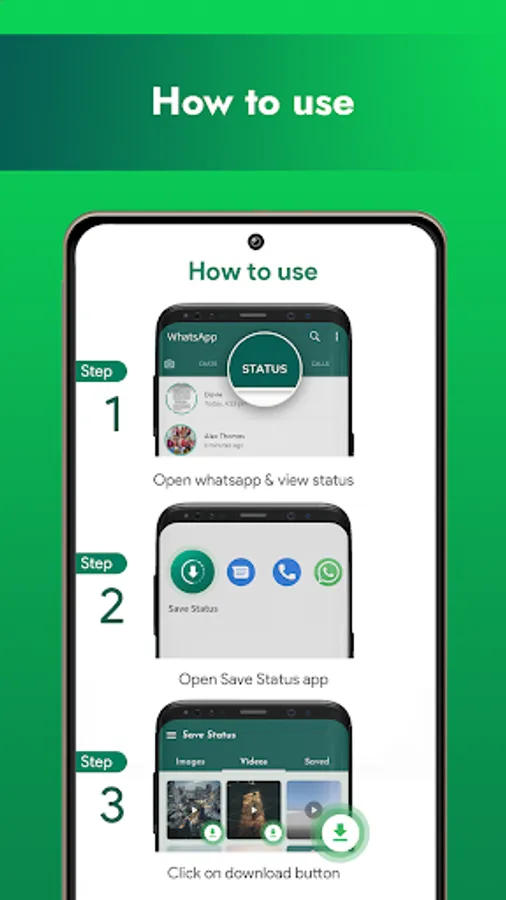 • Download all HD video status and photos easily with the WhatsApp status saver app.