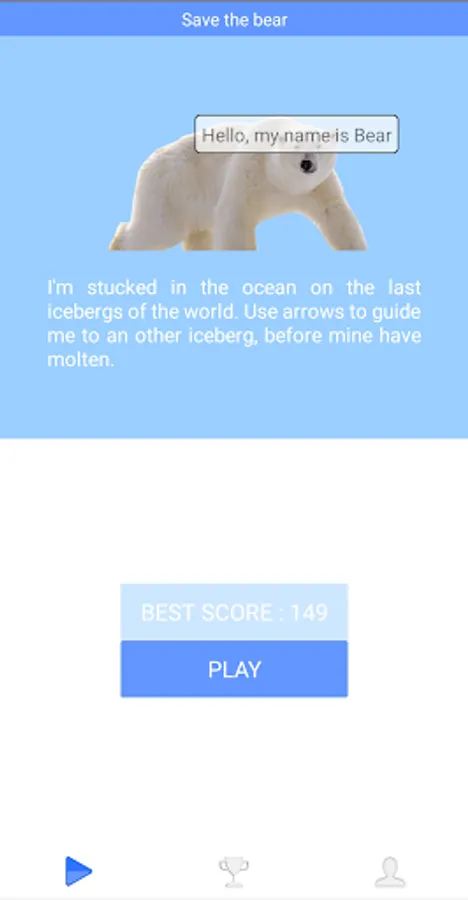 Icebergs are melting. Use arrows to help the last polar bear still alive, to jump to an other iceberg, before his one has molten. Stay alive more time as you can to ear more point. Sometime a surprise will be hidden on an iceberg !