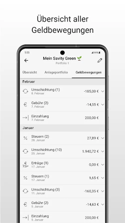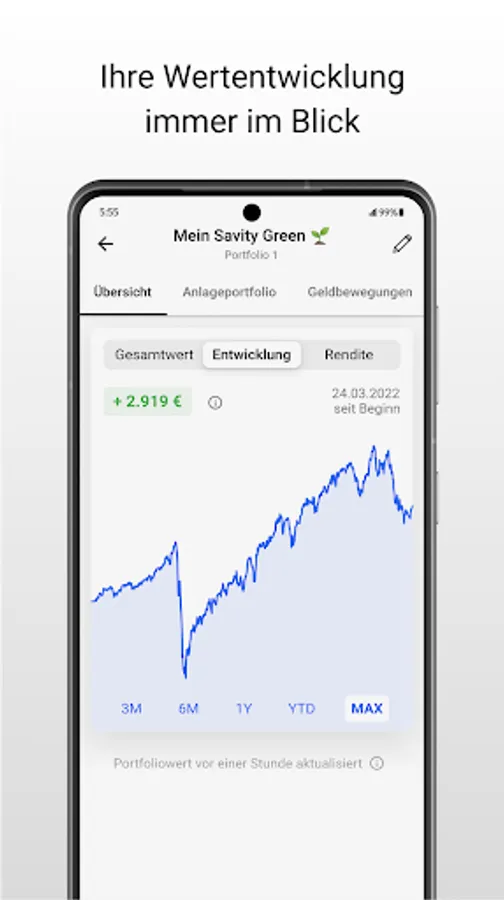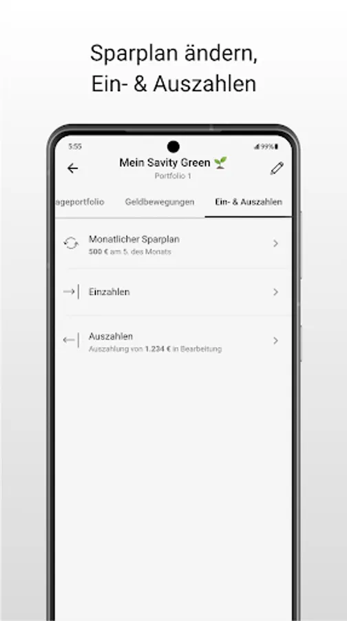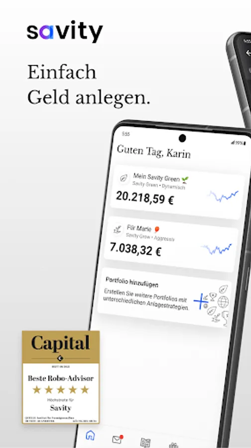 With the Savity app you can keep an eye on your investments anytime, anywhere. Deposits and withdrawals or changes to the savings plan are possible flexibly at any time.