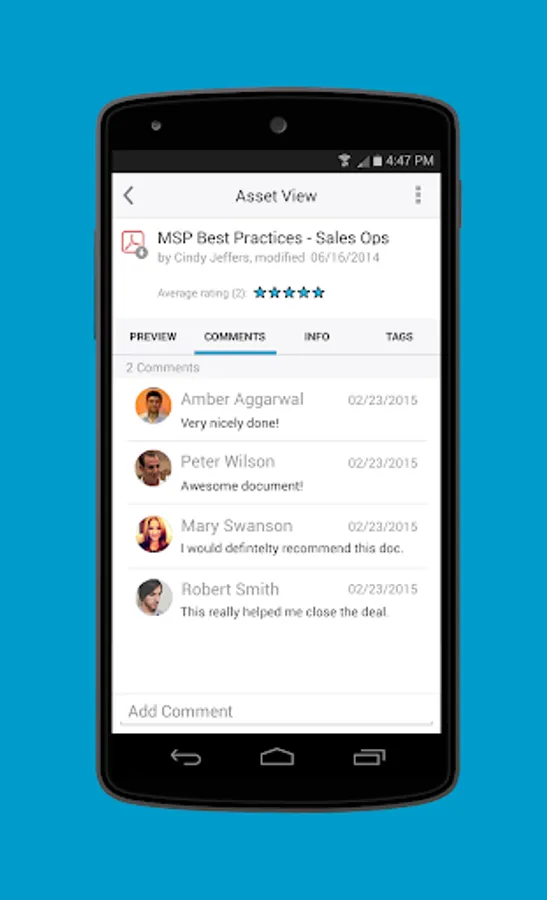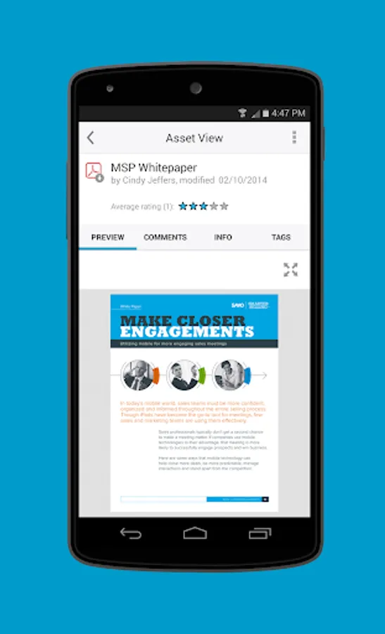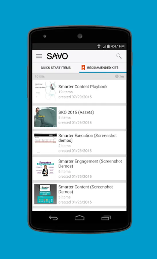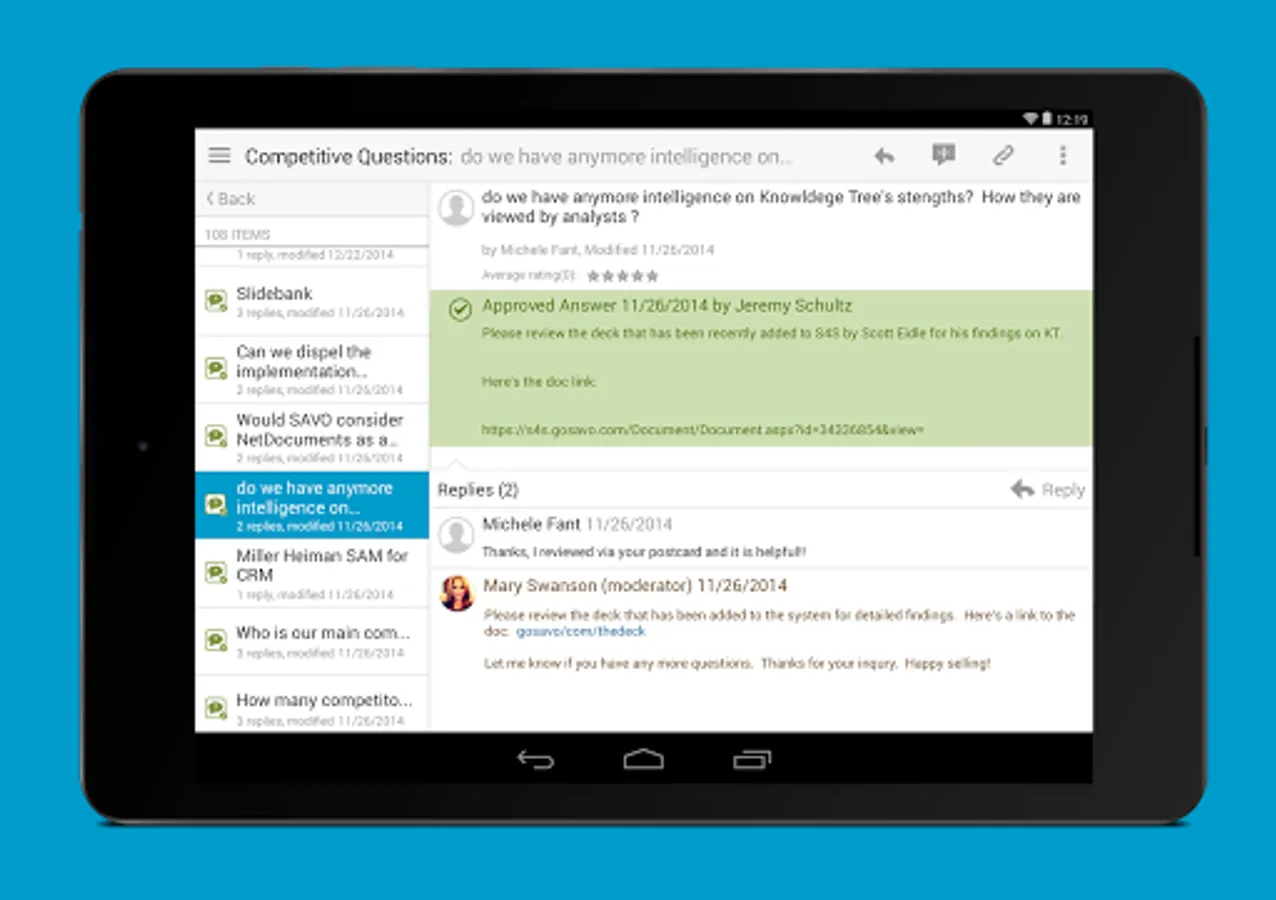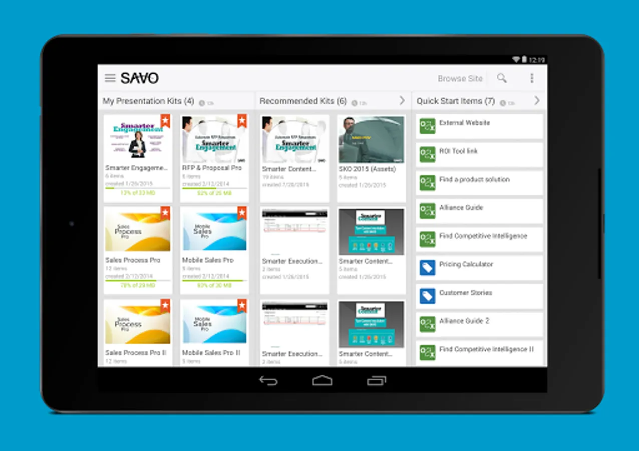 SAVO Mobile for Android improves your sales execution by allowing road warriors like you to leverage the best possible information for each sales conversation, no matter where in the world you are. You can research competitors, ask questions of subject matter experts, and even share win stories directly from your Android device, when that information is most timely and relevant.