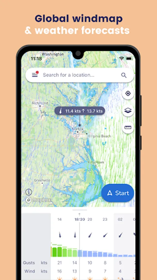 Use the weather forecast graph to scroll through days and times to see the effect on weather conditions, wind strength and direction. Use the wind icon to see a visual overlay of wind barbs!