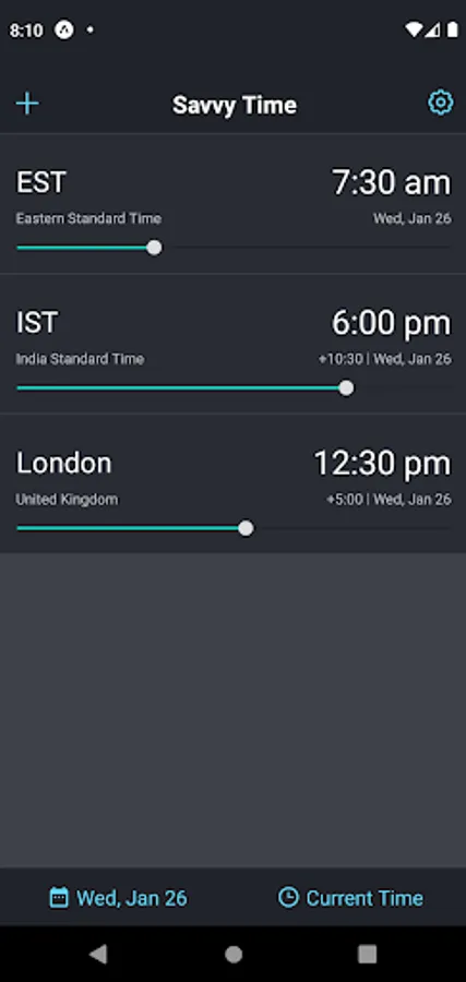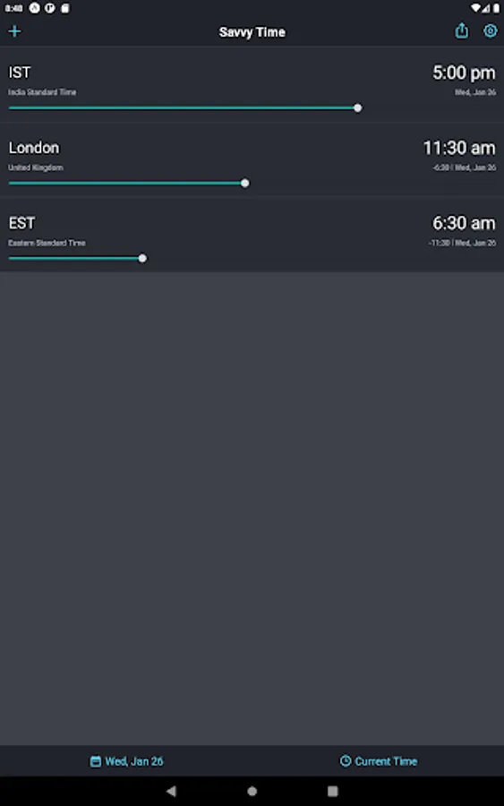 Time zone converter between multiple locations worldwide. Works offline without internet connection. Allows find, add and compare 4 000+ cities and about 300 time zones. Converts times instantly as you type, in both direction.