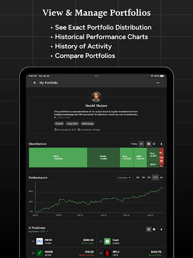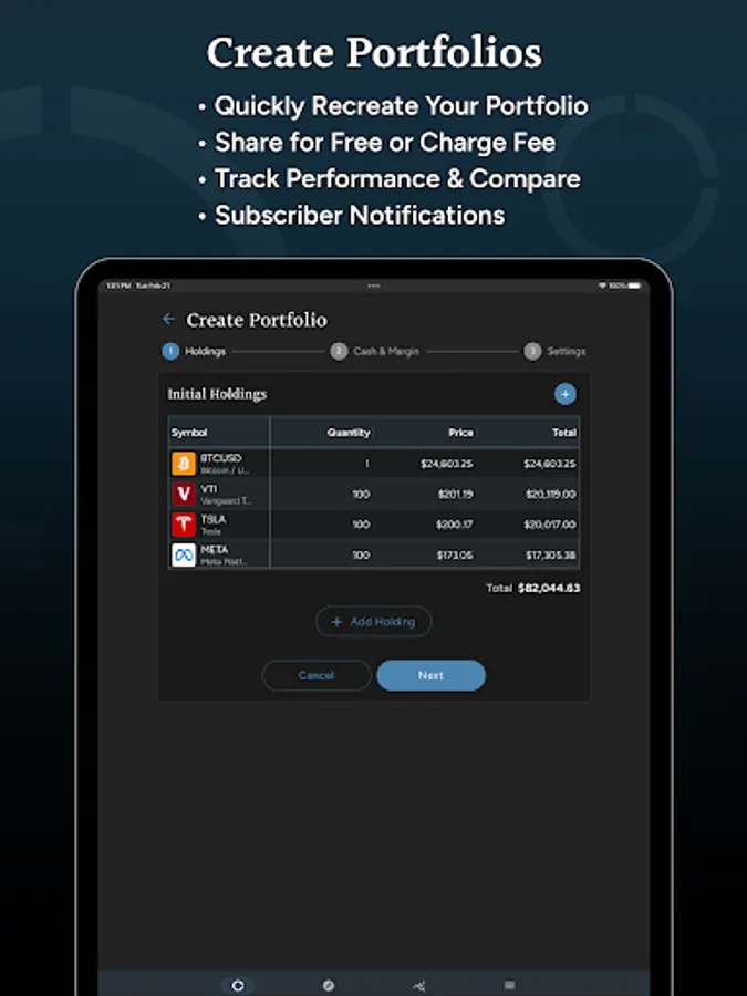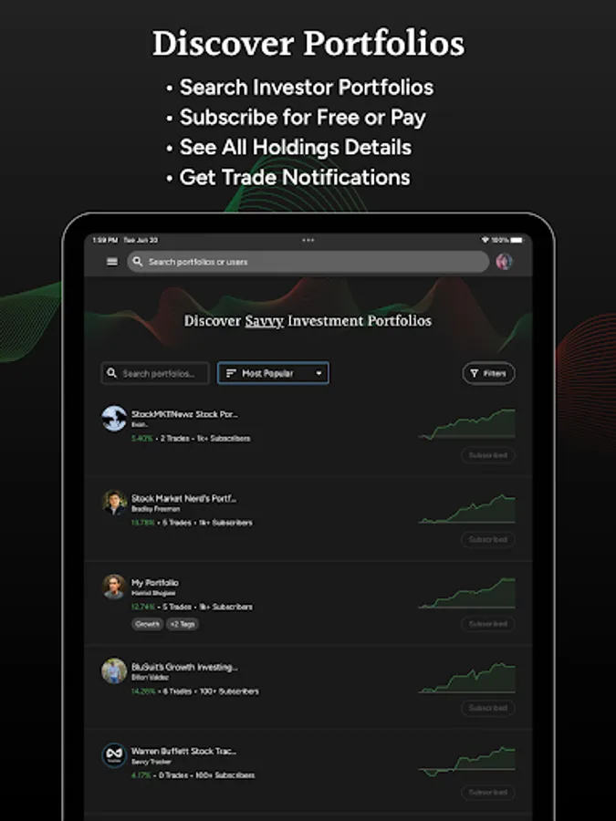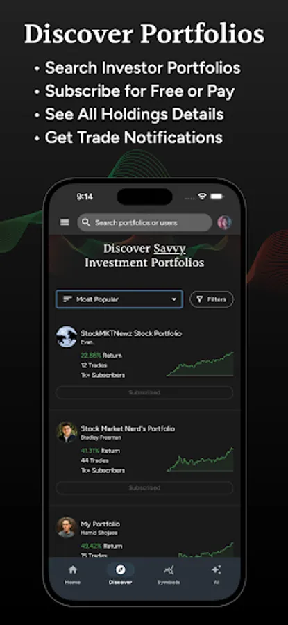 Track all your stock and crypto investments in one place using Savvy Trader. Create virtual portfolios of your favorite stocks and crypto for yourself or share them with others. When you choose to share your portfolio, you can do so for free or charge a monthly subscription fee and earn recurring income by sharing your portfolio.