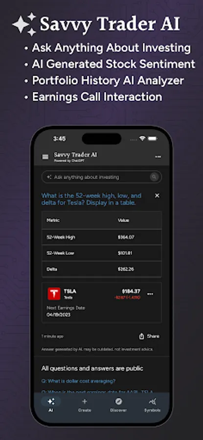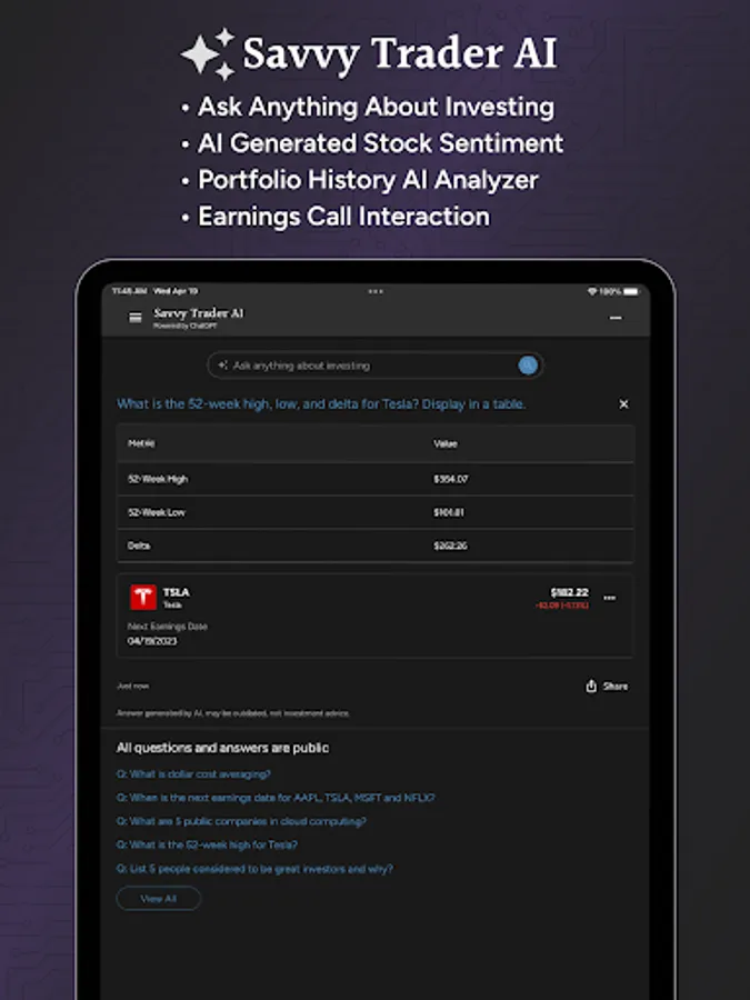 Savvy Trader AI combines the power of ChatGPT with Savvy Trader for stocks and investing related questions.